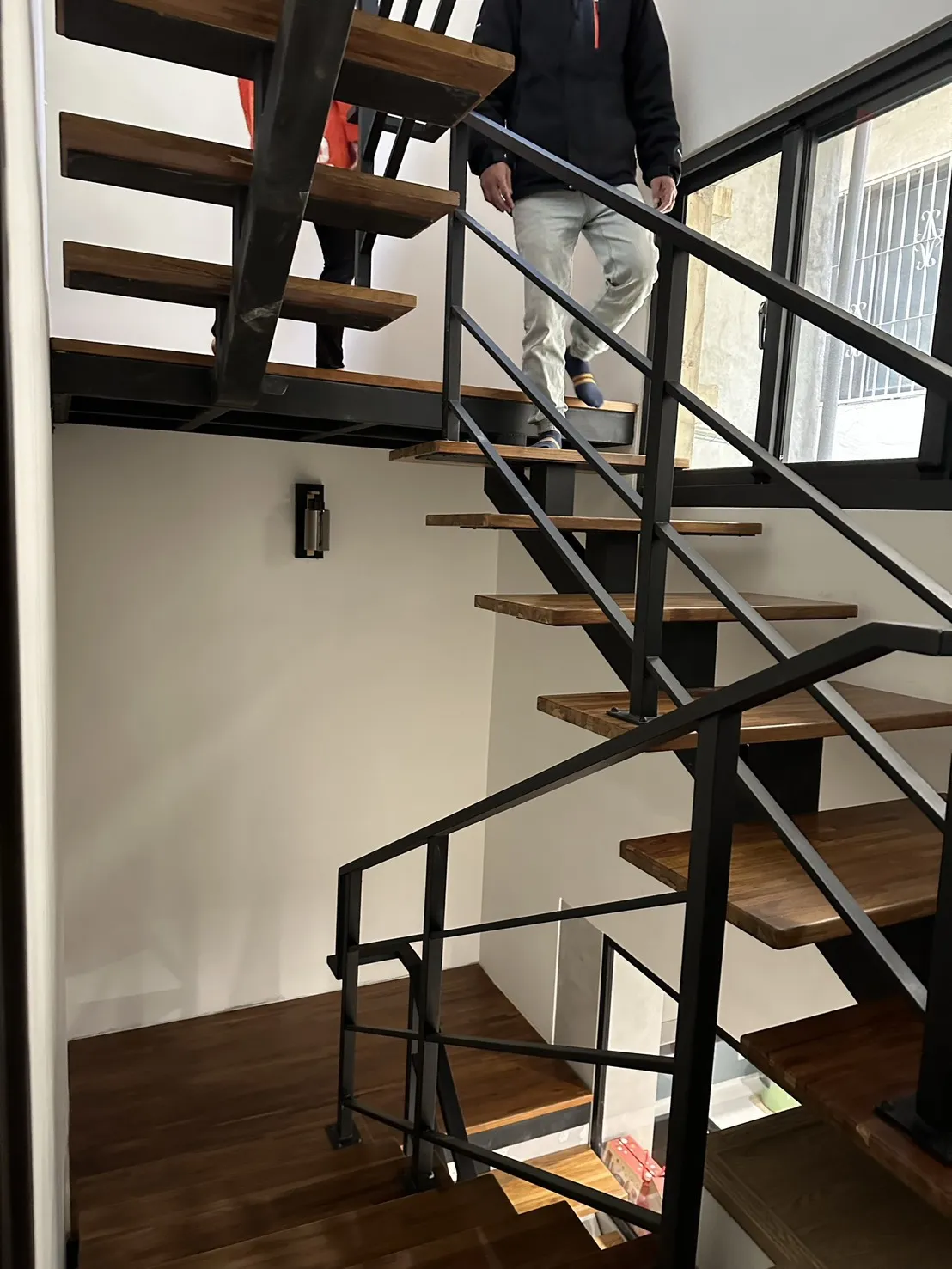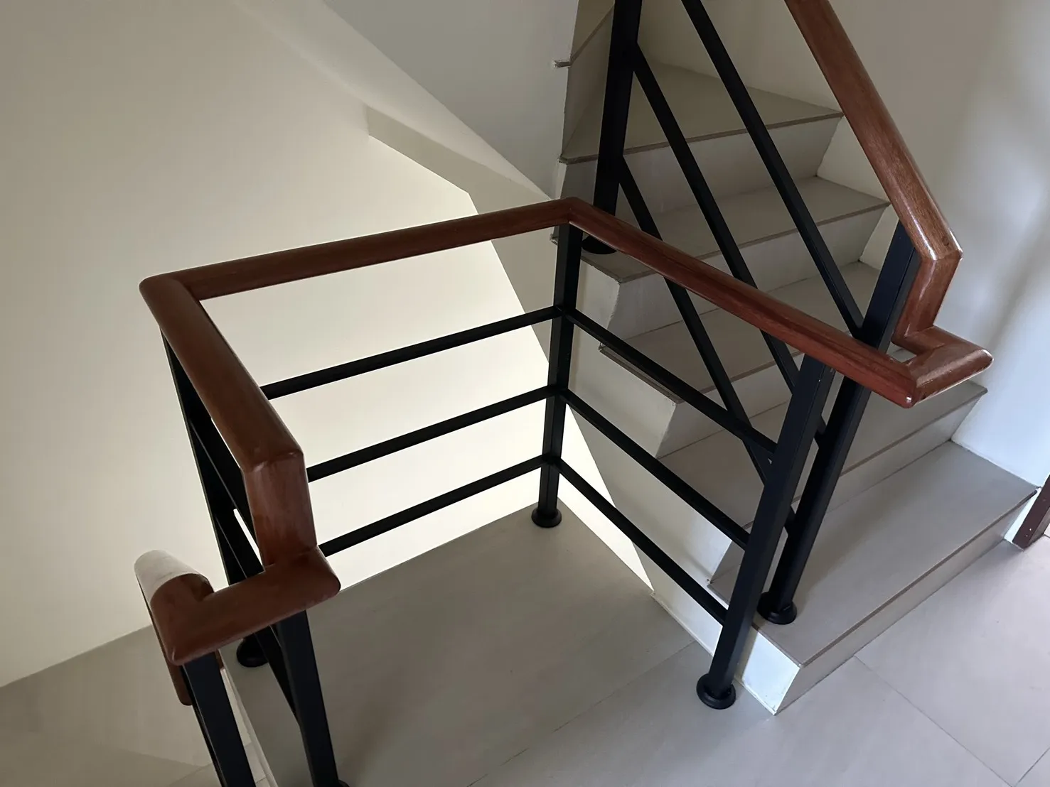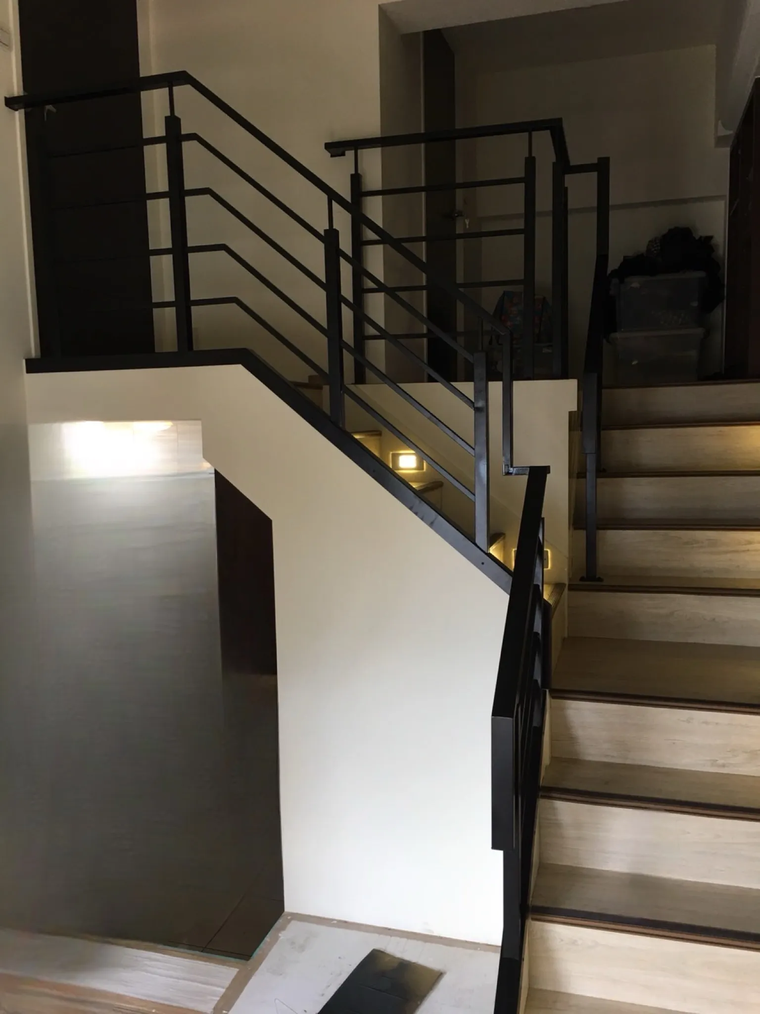 新竹竹北|住宅不銹鋼樓梯扶手工程-本案位於新竹竹北住宅樓梯空間,採用黑色不銹鋼結構搭配實木扶手,線條簡約俐落,兼顧行走安全與居家溫潤質感。