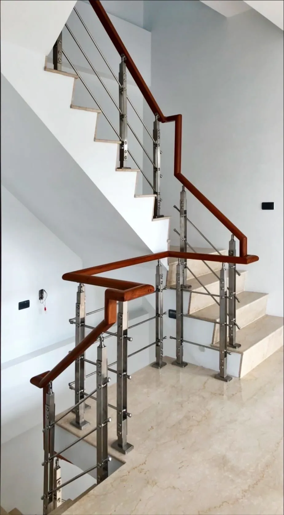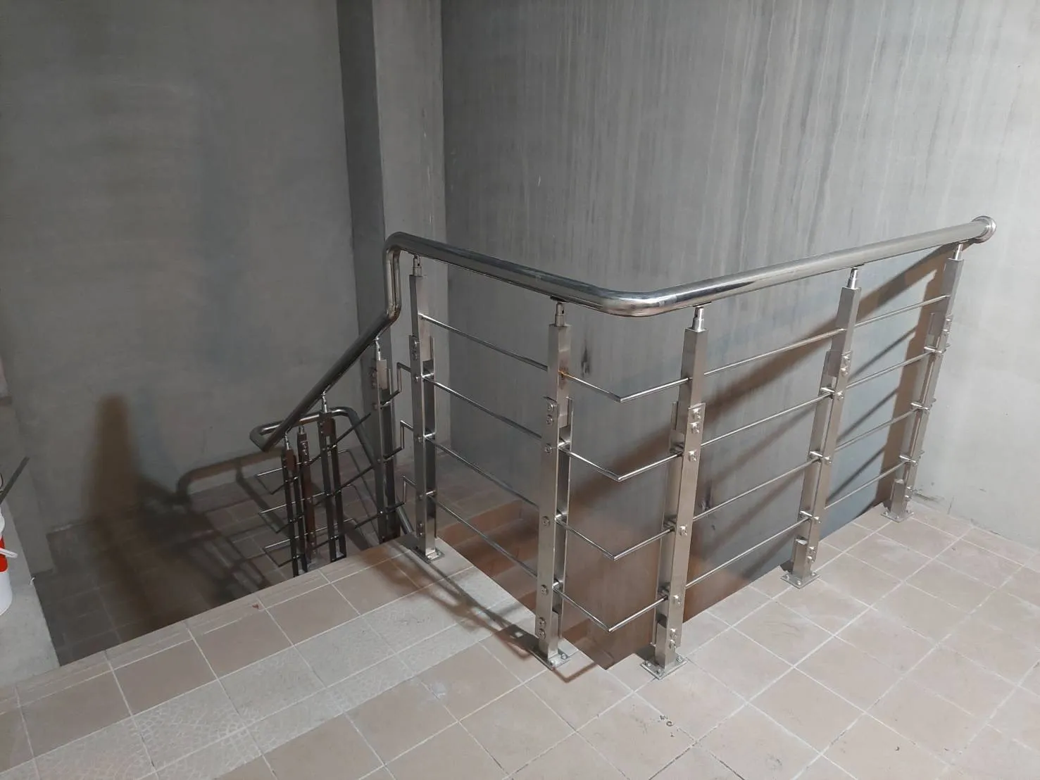 台中潭子|住宅不銹鋼樓梯扶手工程-本案位於台中潭子住宅,樓梯採不銹鋼結構搭配實木扶手,轉角細節精緻,線條穩重俐落,兼顧安全防護與居家整體美感。