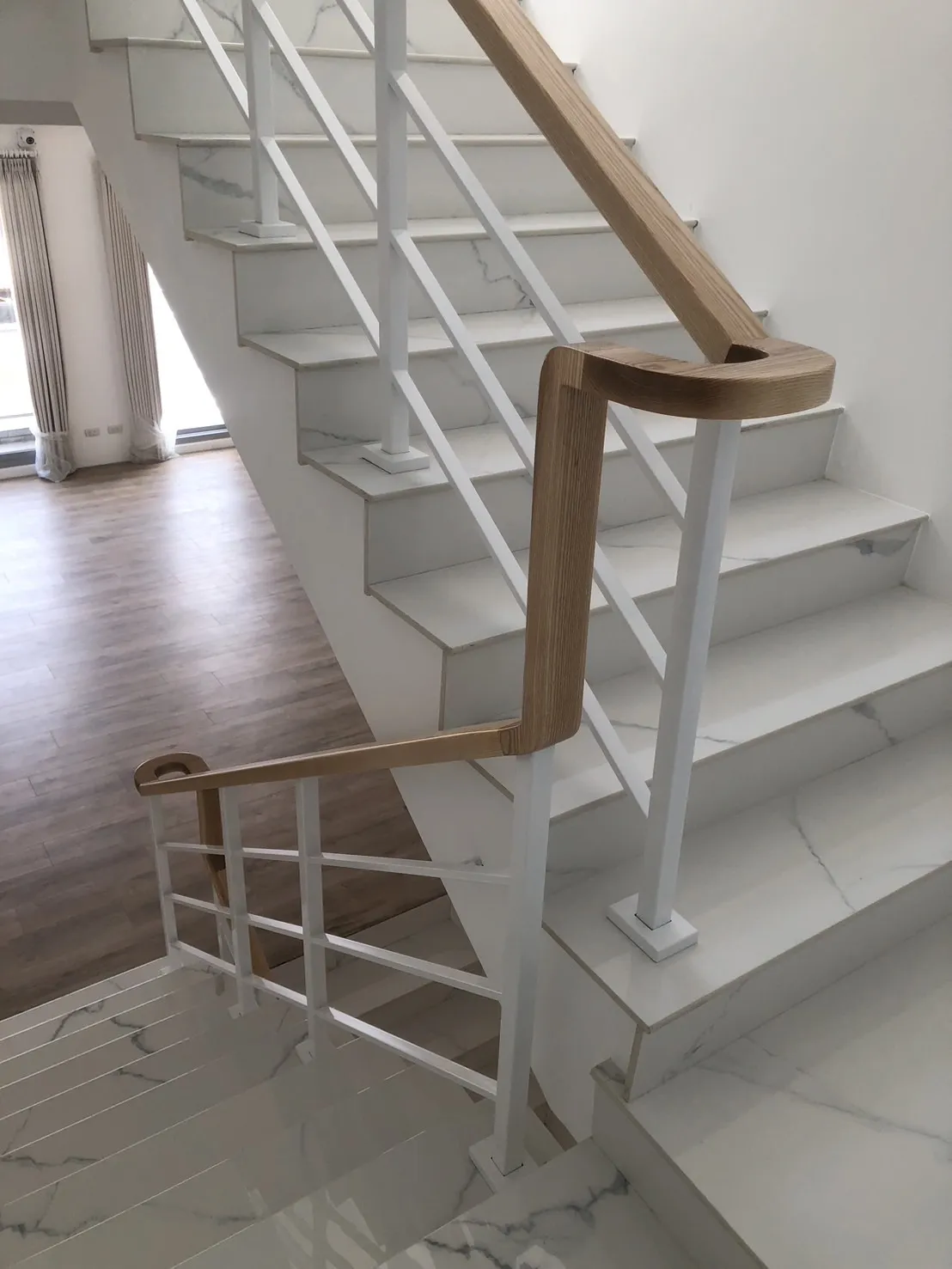 台中梧棲|高級住宅不銹鋼樓梯扶手工程-本案位於台中梧棲自建豪宅,樓梯採用不銹鋼結構搭配實木扶手,線條俐落、手感溫潤,兼顧安全防護與高端住宅質感。