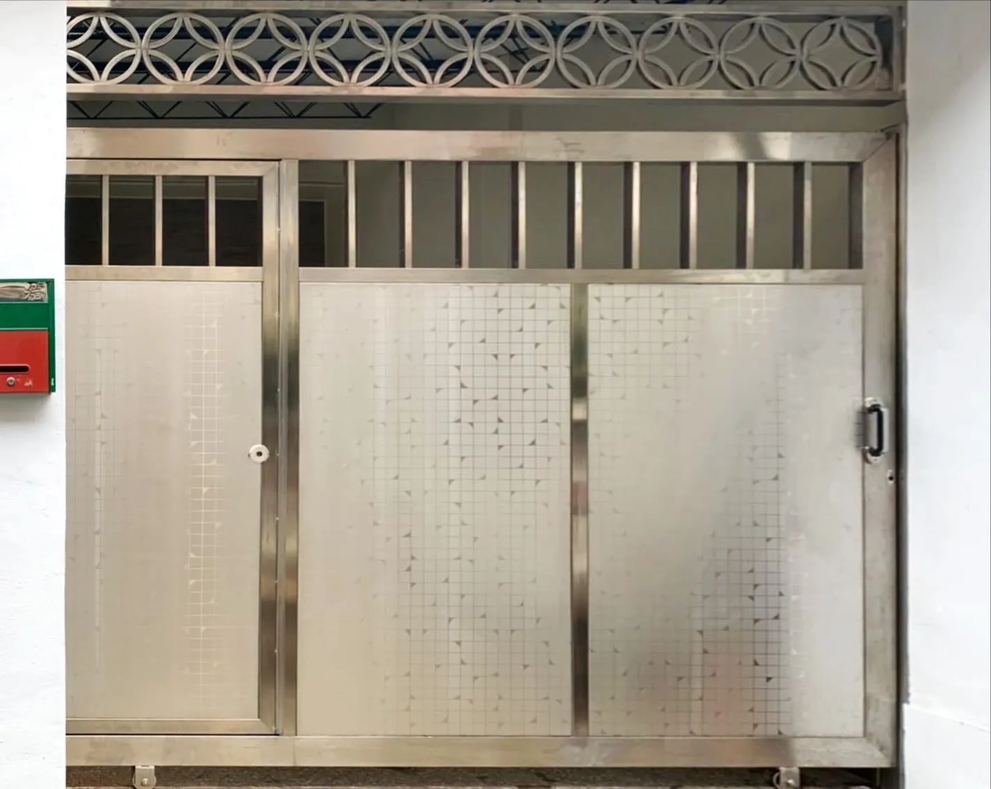 台中潭子|不銹鋼霧面板住家入口大門-本案位於台中潭子,採用不銹鋼霧面板大門設計,結合上方通風欄與圓環造型元素,兼顧隱私、防護與耐用性,呈現實用且耐看的住宅入口風格。