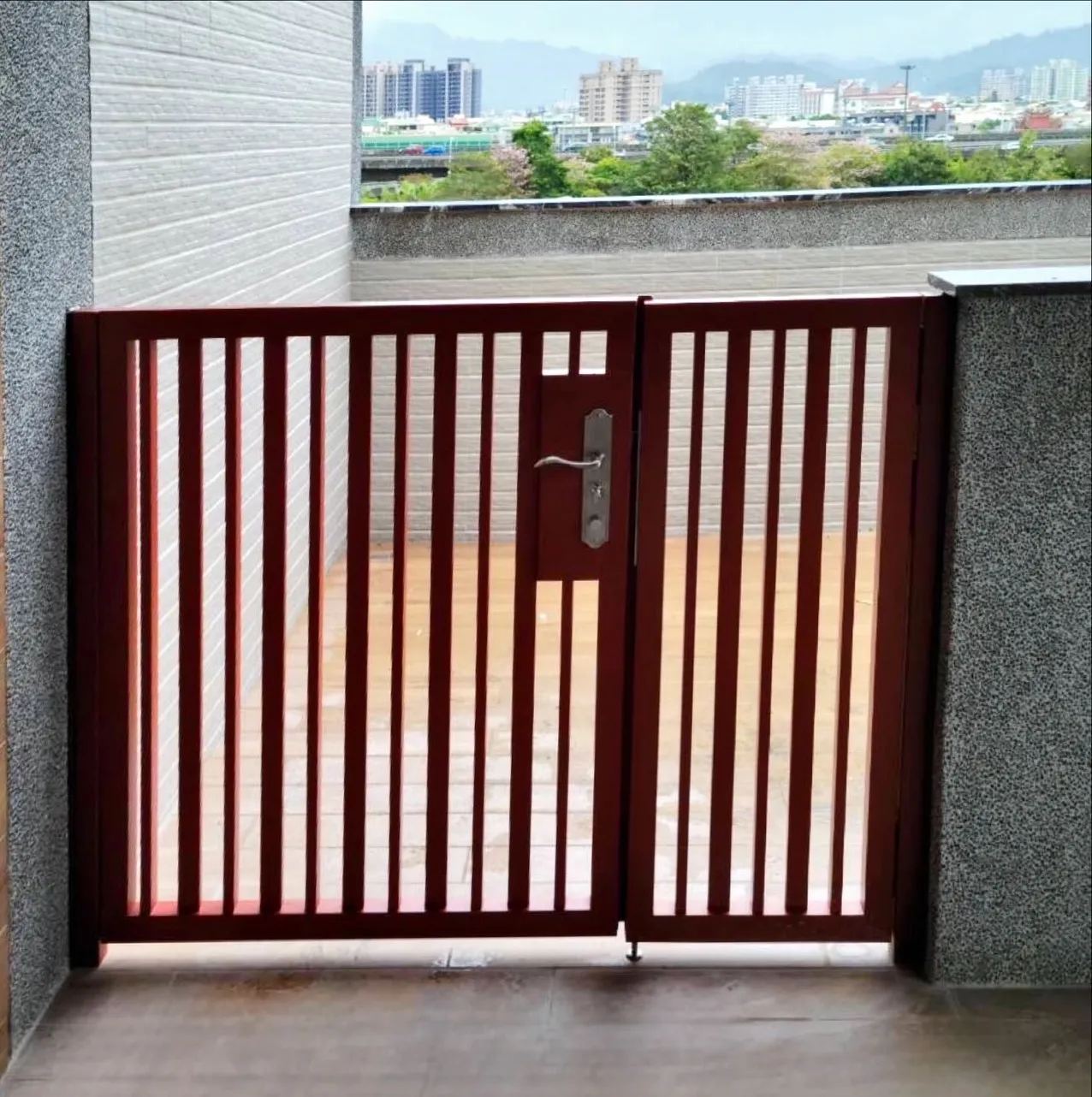台中東區|不銹鋼直條格柵頂樓庭院大門-本案位於台中東區住家頂樓庭院,採用不銹鋼直條格柵大門設計,兼顧通風採光與安全性,搭配穩固門鎖五金,呈現實用耐候的戶外庭院入口風格。