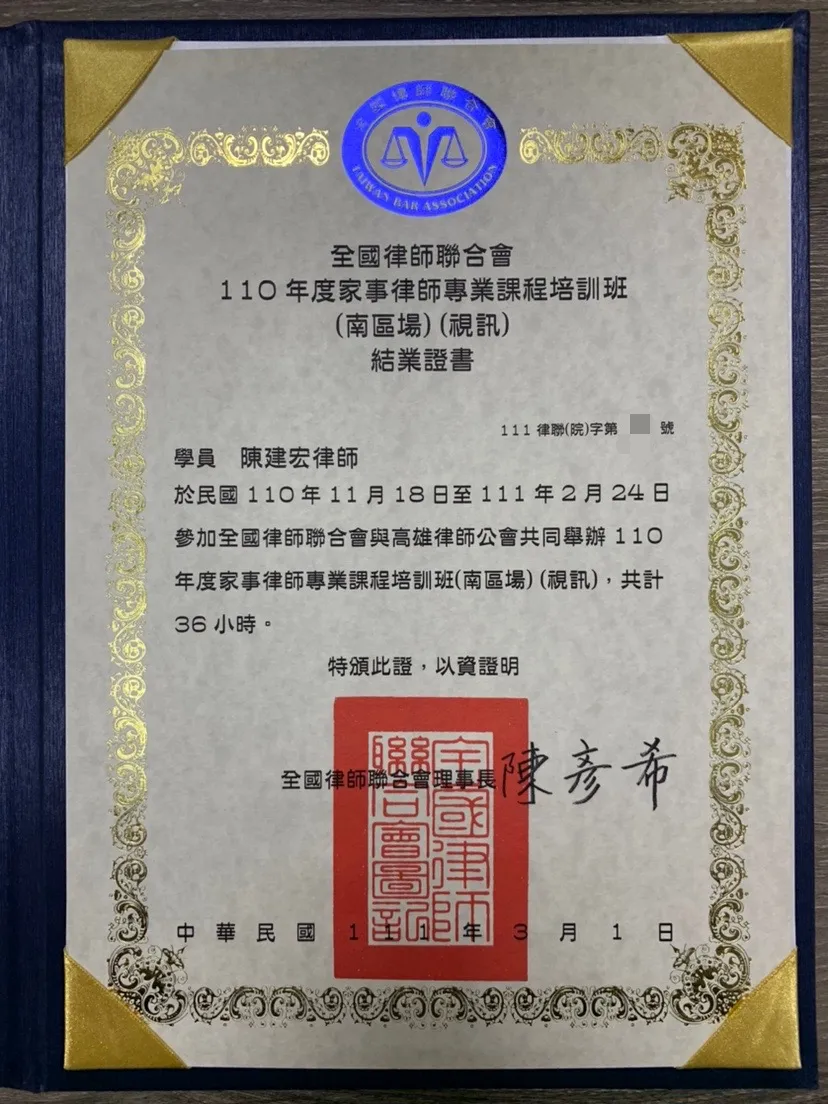 本所陳建宏律師參加家事專業課程培訓順利結業