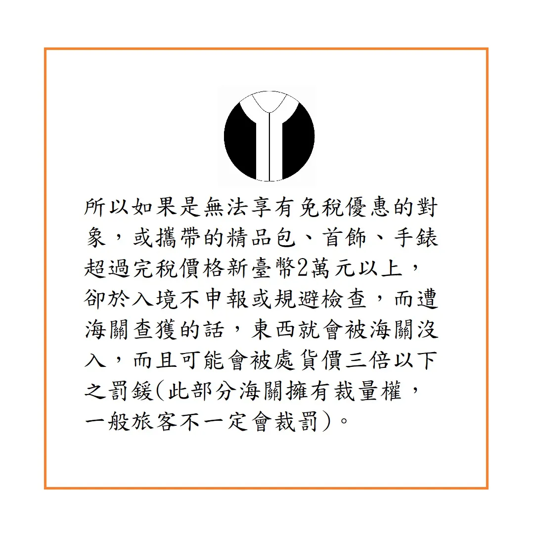 所以如果是無法享有免稅優惠的對象,或攜帶的精品包、首飾、手錶超過完稅價格新臺幣2萬元以上,卻於入境不申報或規避檢查,而遭海關查獲的話,東西就會被海關沒入,而且可能會被處貨價三倍以下之罰鍰(此部分海關擁有裁量權,一般旅客不一定會裁罰)[註2]。