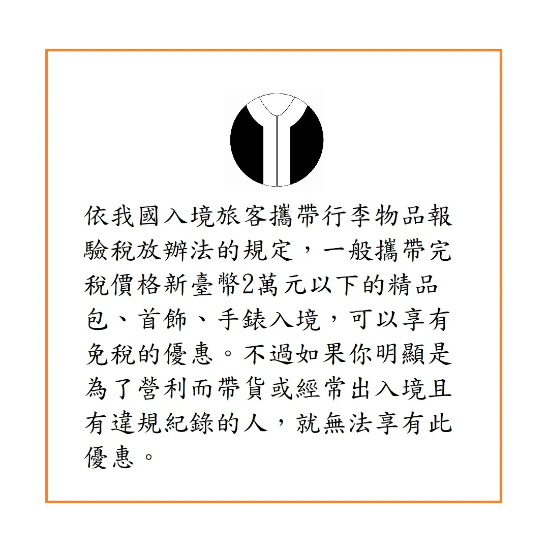 依我國入境旅客攜帶行李物品報驗稅放辦法的規定,一般攜帶完稅價格新臺幣2萬元以下的精品包、首飾、手錶入境,可以享有免稅的優惠。不過如果你明顯是為了營利而帶貨或經常出入境且有違規紀錄的人,就無法享有此優惠[註1]。