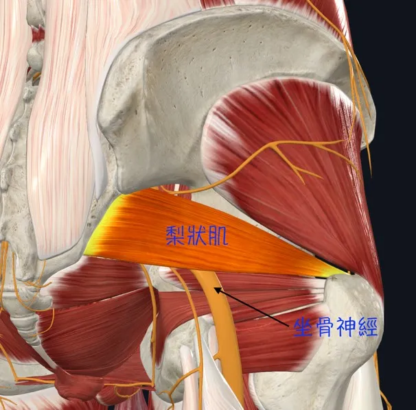 梨狀肌位在臀部深層,靠近坐骨神經。若久坐、久開車、運動後緊繃或肥厚,可能刺激附近的坐骨神經,造成臀部深層痛,並往大腿後側放散。近年文獻也提醒,很多被稱為梨狀肌症候群的患者,其實更接近「深臀部症候群」的概念,也就是臀部深層多個結構一起造成神經受刺激。