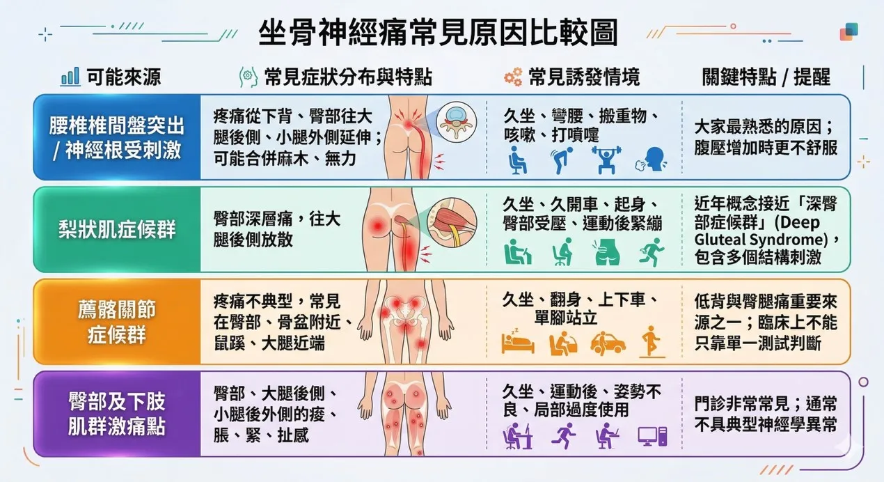 可能來源 常見症狀分布 常見誘發情境 腰椎椎間盤突出/神經根受刺激 下背、臀部、大腿後側、小腿外側,可能合併麻、無力 久坐、彎腰、搬重物、咳嗽、打噴嚏 梨狀肌症候群 臀部深層痛,延伸到大腿後側 久坐、久開車、起身、臀部受壓 薦髂關節症候群 臀部、骨盆周圍、鼠蹊、大腿近端 久坐、翻身、上下車、單腳站立 臀部及下肢肌群激痛點 臀部、大腿後側、小腿後外側的痠脹緊扯感 久坐、運動後、姿勢不良、局部過度使用 中醫如何看待坐骨神經痛?