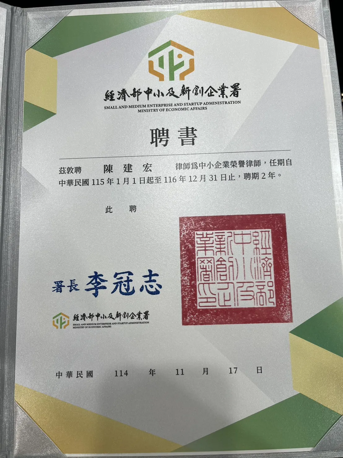 賀!陳建宏律師獲選115-116經濟部榮譽律師