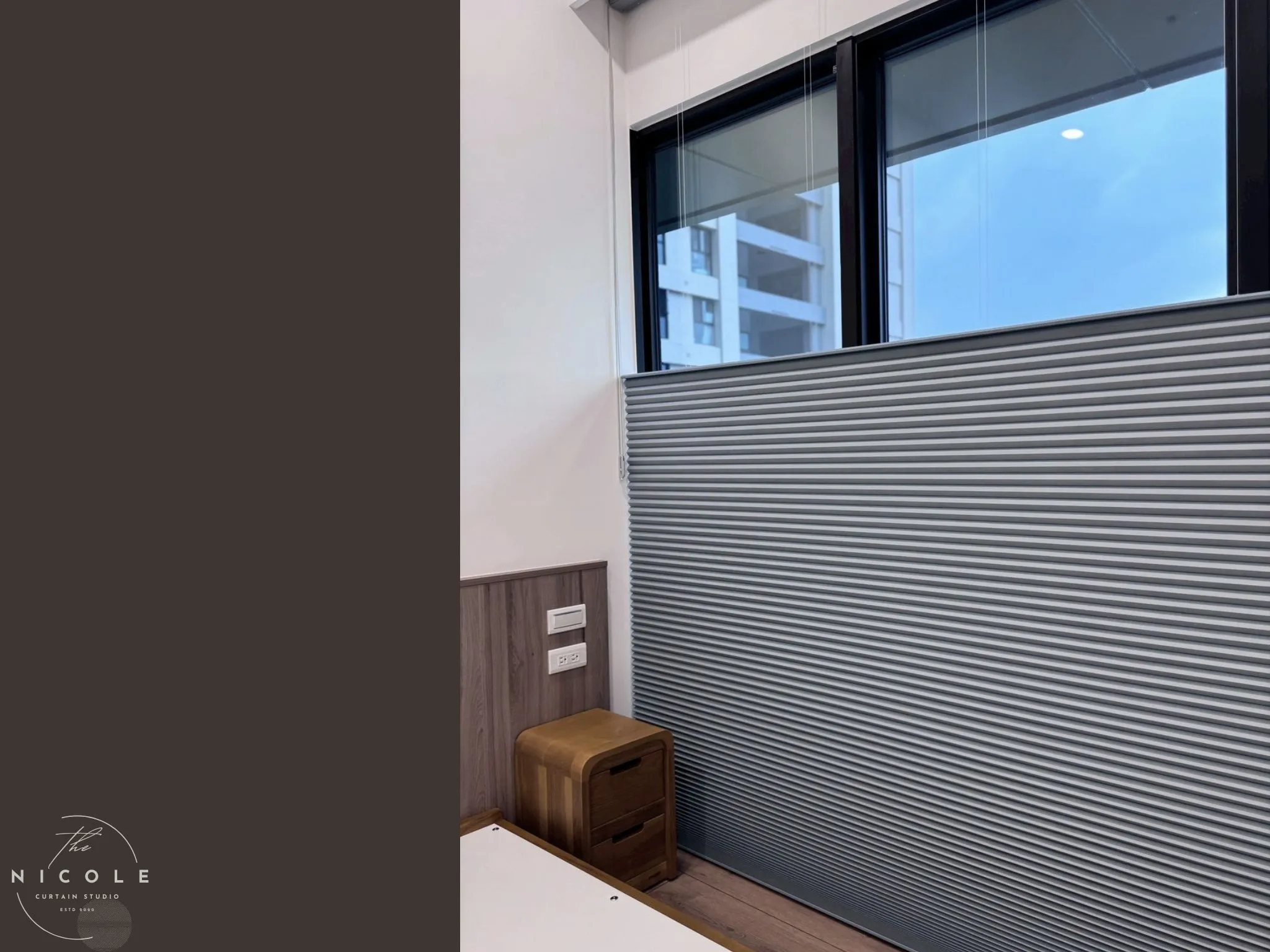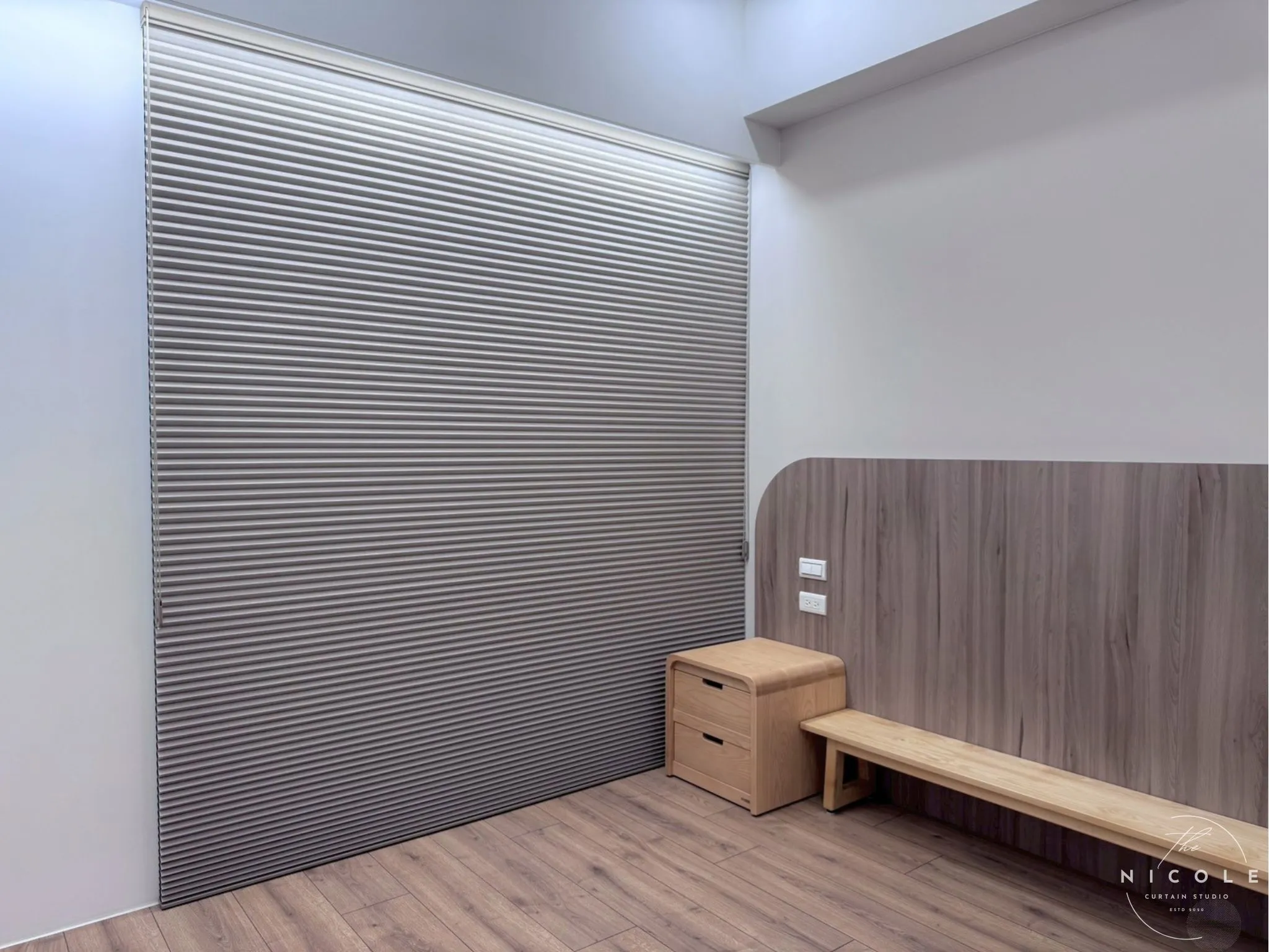 主臥延續全室一致的高級中性色,米色系遮光風琴簾能和木質、淺牆面或大地色系軟裝自然融合,視覺更溫暖、睡眠氛圍更安定。遮光材質讓光線管理更直接,搭配風琴簾的結構特性,對隔熱與節能更有感,尤其適合台中西屯日照強、溫差大的居住型態。