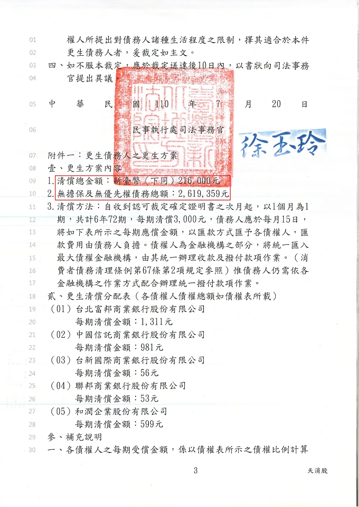 當事人積欠無擔保債務262萬元,與律師討論並經律師專業分析,向法院聲請更生,成功爭取法院裁定認可更生方案,總清償金額21萬元,清償比例8.24%。