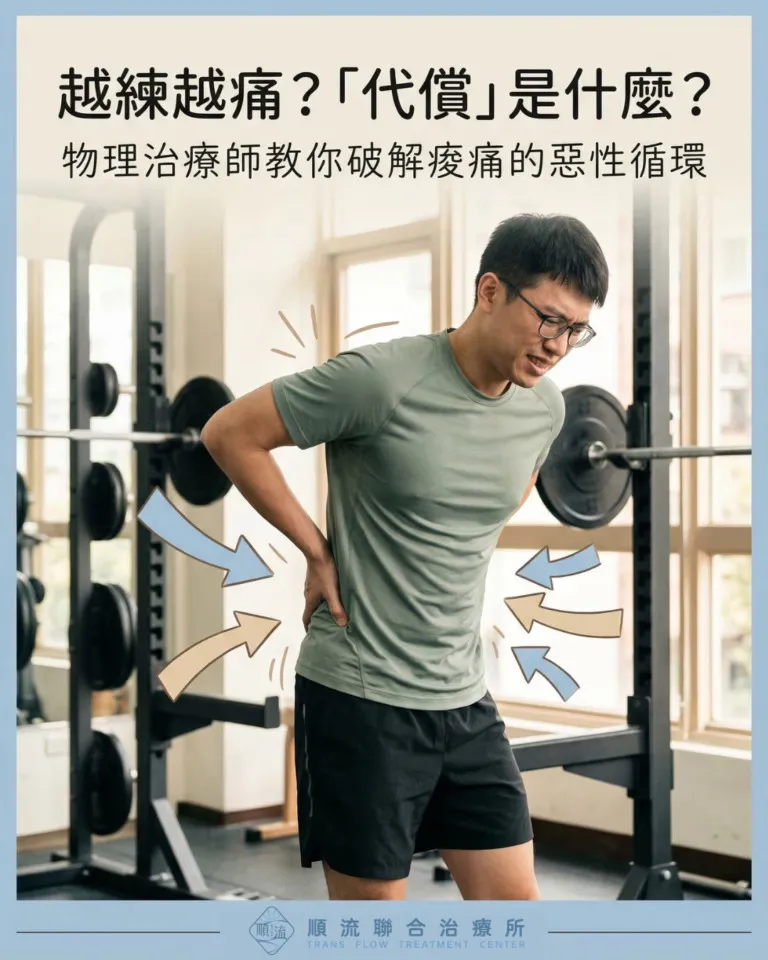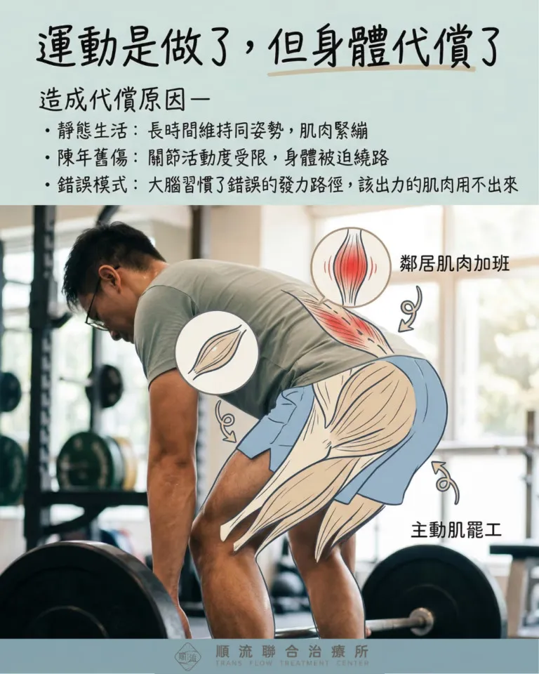 簡單來說,代償(Compensation)就是身體的「備用電源」。當目標肌肉因為長期沒用而「罷工」時,周邊的肌肉就會跑出來「幫忙」。