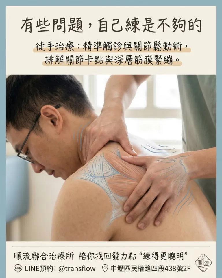 治療師筆記: 「徒手治療不只是按摩,更是透過關節鬆動術與深層壓力,排解代償肌的武裝,讓原本『卡住』的關節重獲自由。」
