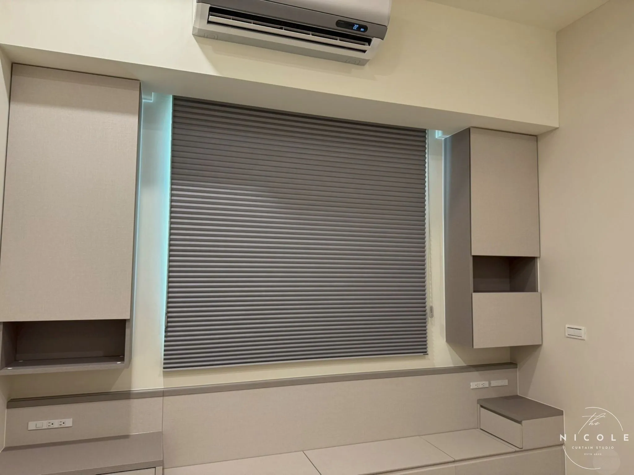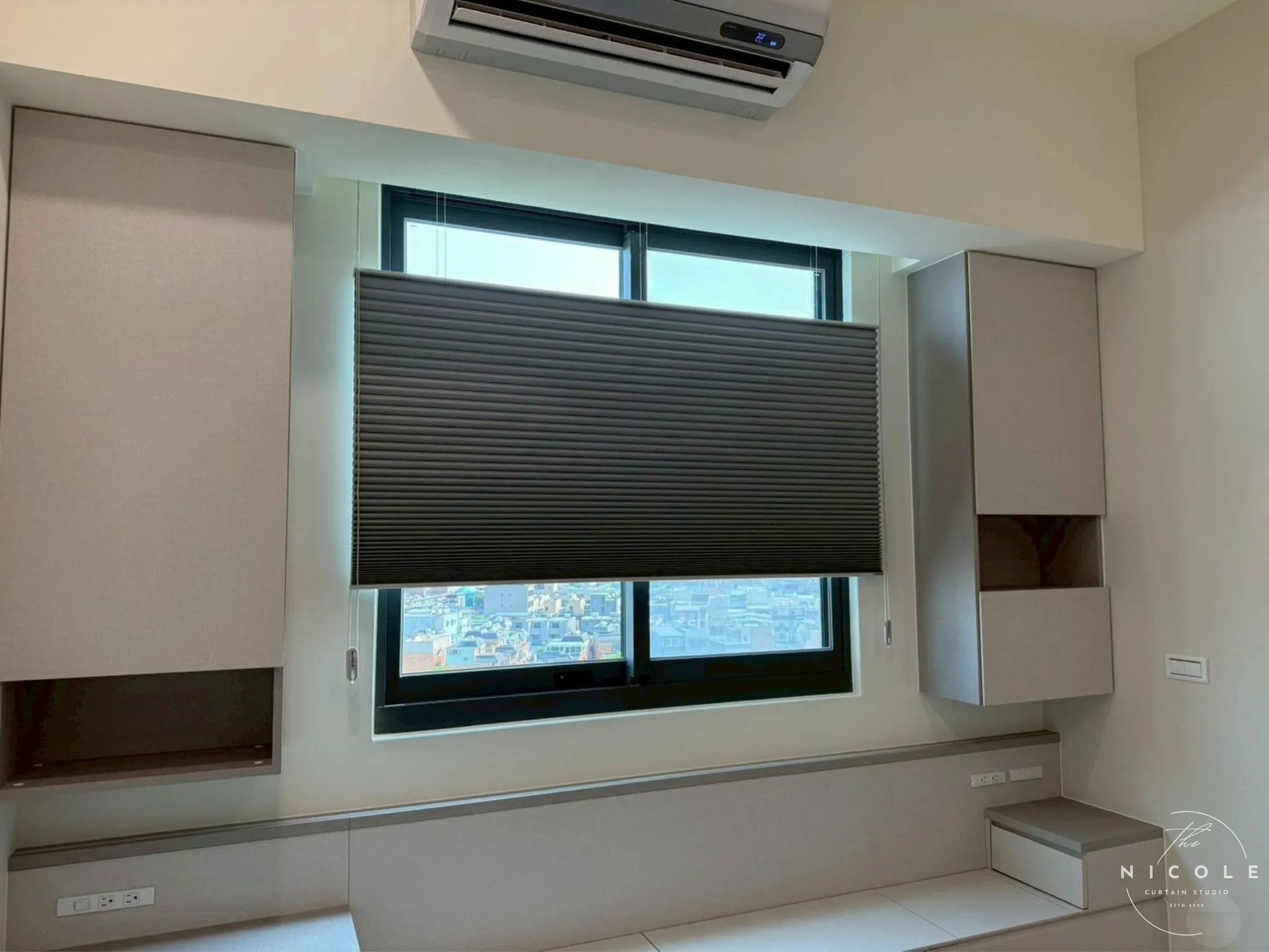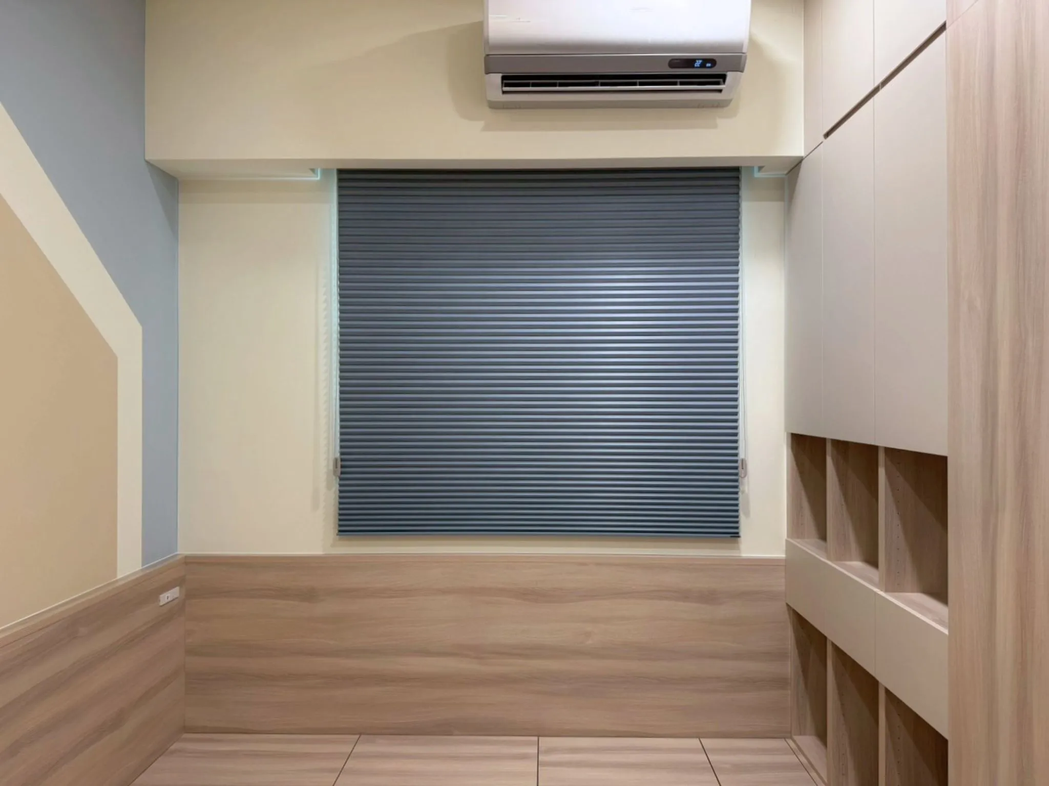 針對次臥特殊的架高木地板與活潑的幾何跳色牆面,竹南頭份窗簾設計團隊特別選用灰藍色遮光風琴簾。灰藍色調精準呼應了牆面的幾何漆色,而風琴簾獨特的立體蜂巢布面材質,巧妙揉合了周圍溫潤的木作櫃體,為空間帶來柔和且高質感的視覺效果。