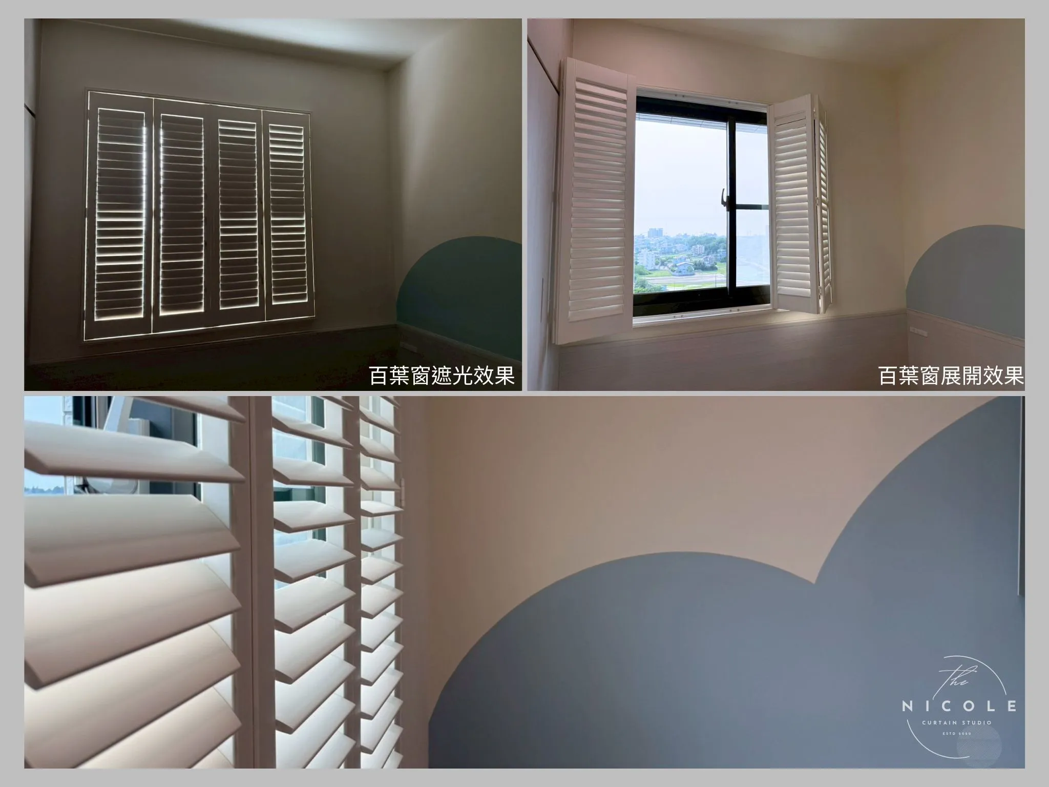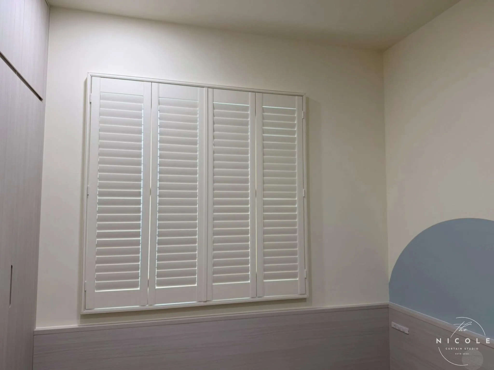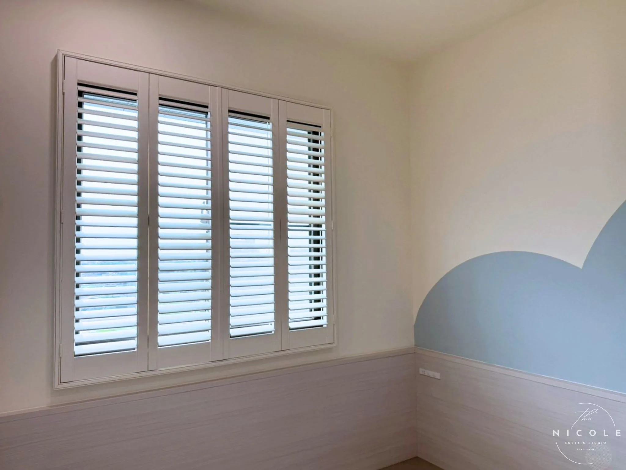 配合牆面的活潑圓弧跳色設計,選用純白色的美式百葉窗。特別採用無繩窗簾系統,不僅外觀簡潔俐落,更大幅增加了居住安全性,滿足屋主對裝潢細節與居家安全的雙重考究。