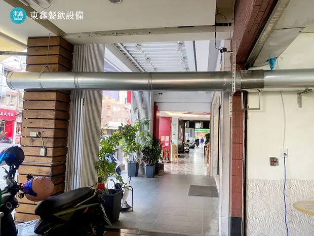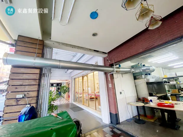落地型油煙罩含蓋了業主的油炸機以及碳烤爐,讓不同高度的器材一樣能夠收集油煙,也讓業主不要去因為油煙去弄髒了租來的店面。鐵門的部分也採用活動型風管,非營業時間也可以關下鐵門不影響使用。