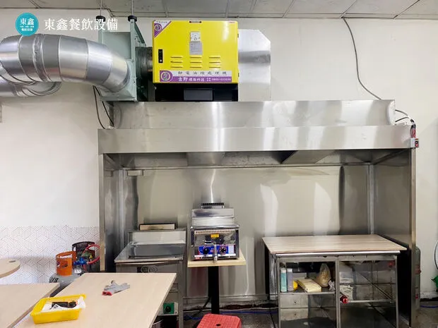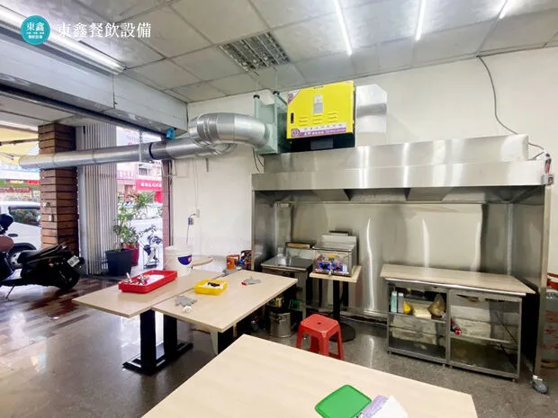 台中餐飲設備落地型油煙罩安裝,將業主所有廚房設備都包覆在一起,不僅好清理,收集油煙的效果也增強,搭配活動型風管,拉下鐵門也能繼續使用喔!