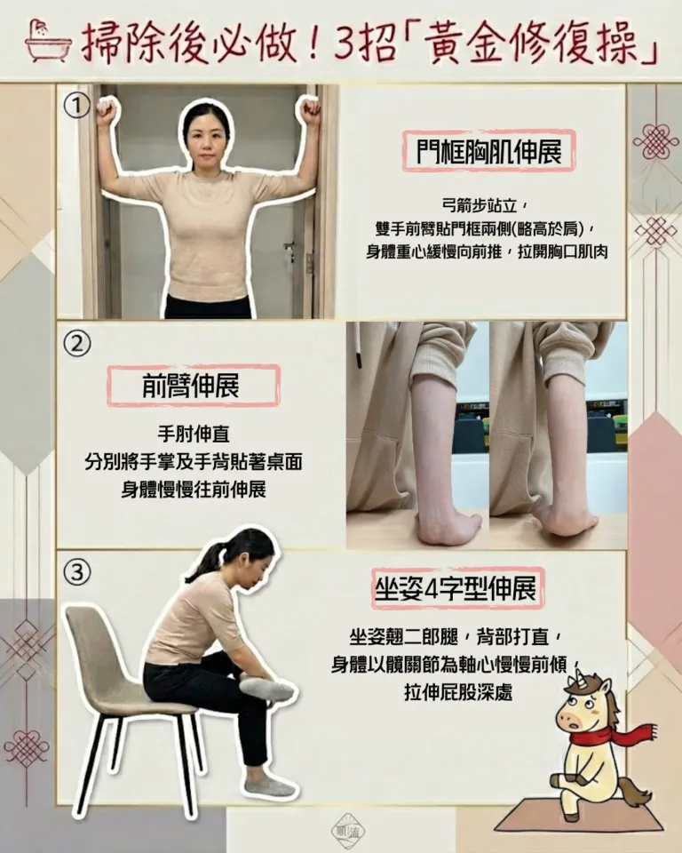 大掃除結束後,肌肉通常處於緊繃縮短的狀態。請務必花 5-10 分鐘進行以下伸展,能有效預防隔天的痠痛,讓身體「歸位」。
