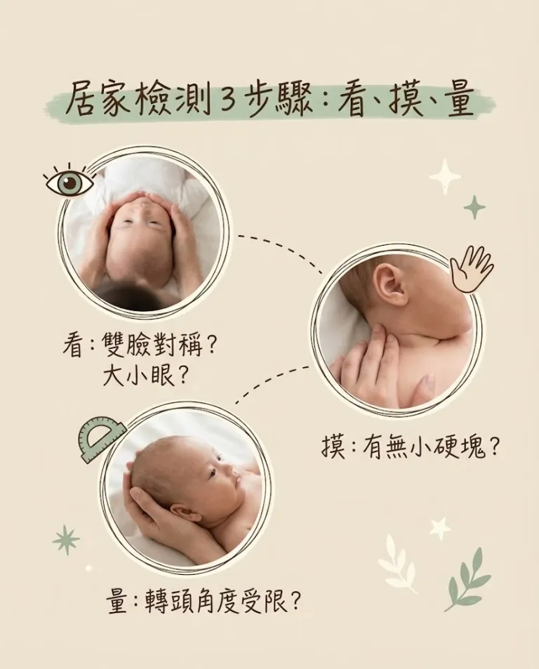 - 摸(肌肉硬塊): 輕輕觸摸寶寶頸部兩側的肌肉,是否感覺到一側有明顯的硬塊,或肌肉張力明顯較高、較硬?