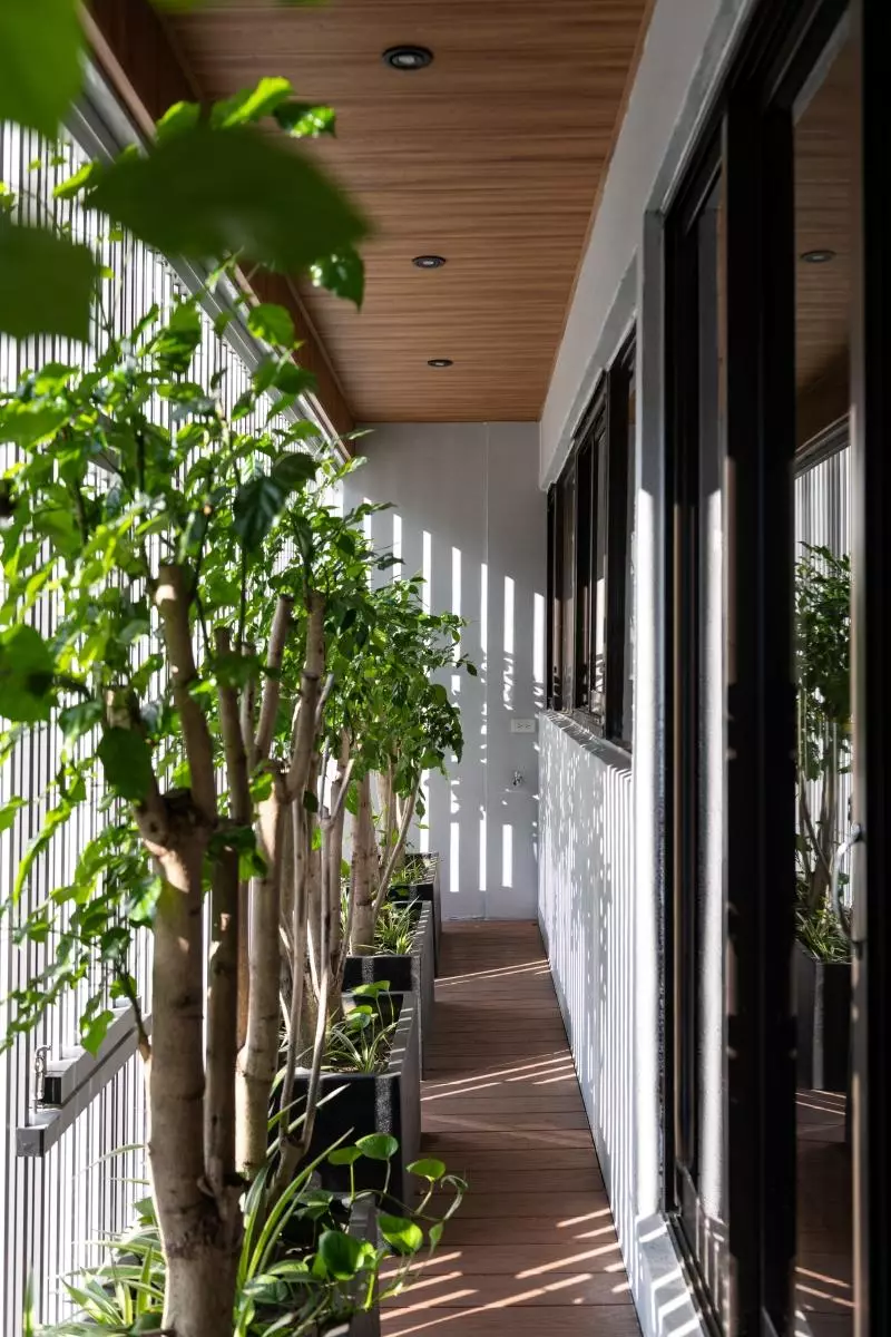 圓潤的格柵曲線象徵包容與圓融,漸層式的排列代表成長與累積,這些形象並非單一符號,而是整體設計中對「天地人合一」理念的體現。格柵如同一層空氣的濾網,既保有建築的通透性,也為內外空間創造了一層有機的過渡,讓風與光在其間自由流動,營造出既穩定又充滿活力的環境氛圍。