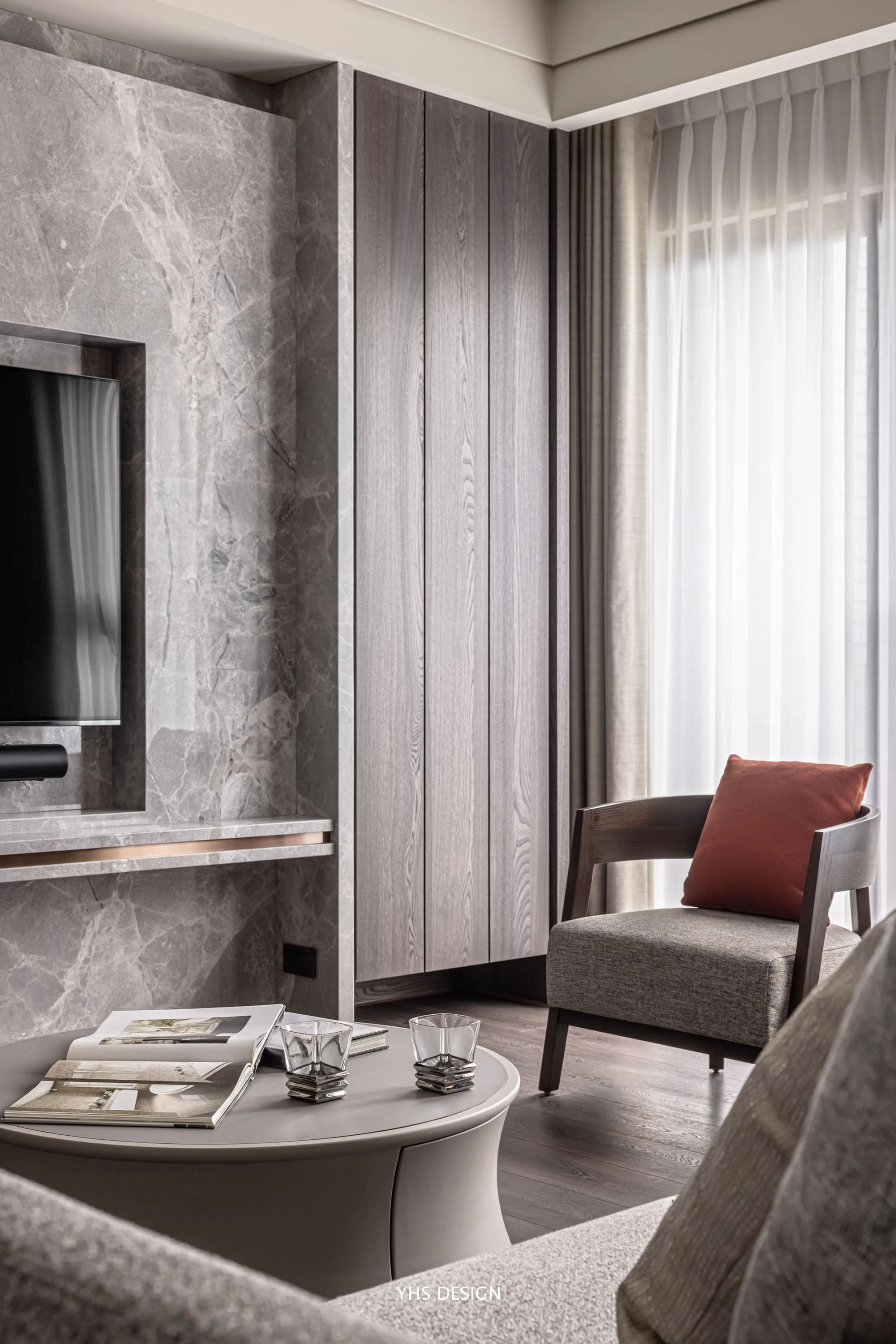 優雅溫潤的米、灰色調做為色彩基底,注入深色框體更顯沉穩舒適,搭配金屬線條勾勒美感,木紋、布料與大理石紋路豐富空間表情,同時保留場域大面採光及自然景致,使陽光透過細沙布簾輕輕穿透,讓自然融入空間和生活,期望打造一處令身心恬靜的居住空間,能靜心享受細緻的設計和生活態度。