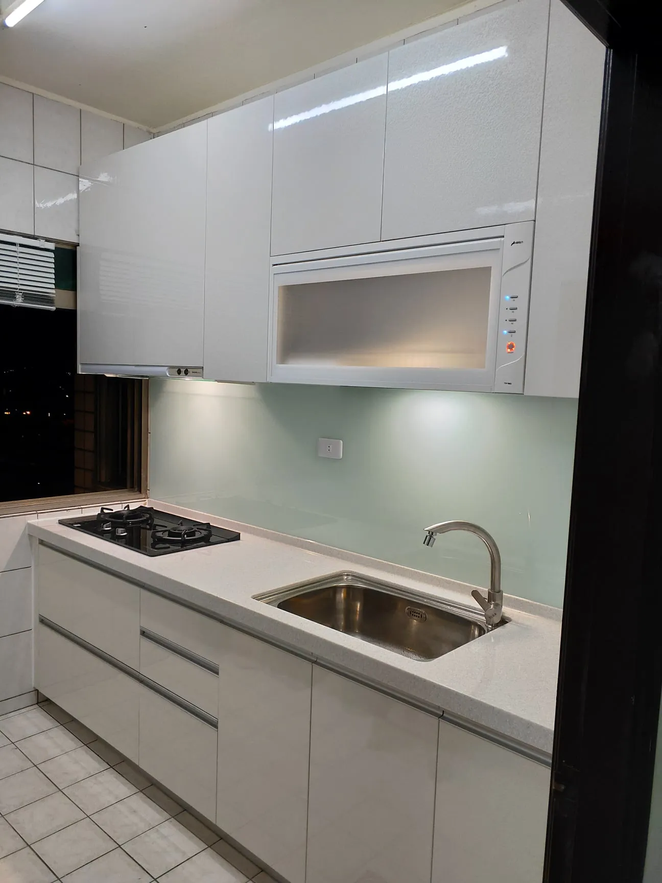恭喜黃先生購入坐落於大肚區外環道的房子,住在10F的黃先生,因為原屋主的廚具已經老舊不堪使用,希望回到家後能有一個溫馨的廚房,因此找我們規劃、設計家中廚具,因為剛買房要花很多錢購入新家電,但又不希望廚房的檯面是傳統冷色調的不鏽鋼檯面,因此選擇平價的人造石,希望用人造石來增加廚房的色彩,也選購了抽屜來收納許多瓶瓶罐罐,黃先生因為工作時間長希望廚房能好整理,又有家的氣氛,因此黃先生選擇多追加烤漆玻璃,讓他不用煩惱原本的磁磚油垢,最後相當注重洗澡品質的黃先生也挑選了櫻花16公升渦輪增壓熱水器,大出水量、精準的溫度控制讓他非常滿意,感謝黃先生