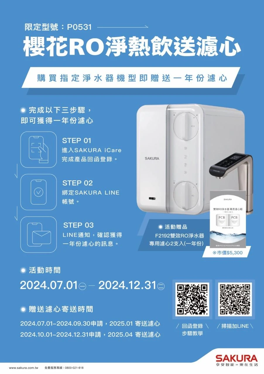 即日起至2024/12/31買櫻花RO淨熱飲送濾心