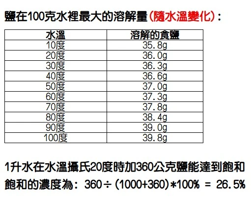 鹽箱在還原注水時濃度會被稀釋 ,以下為飽和濃度計算表 :