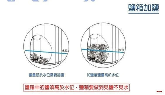三 、軟水鹽錠若只有在水底一層,飽和鹽水比較重,在需要還原時注水,水在上層的濃度會比較低,還原濃度不足會降低效果,會產生軟水未達到用量就沒軟水