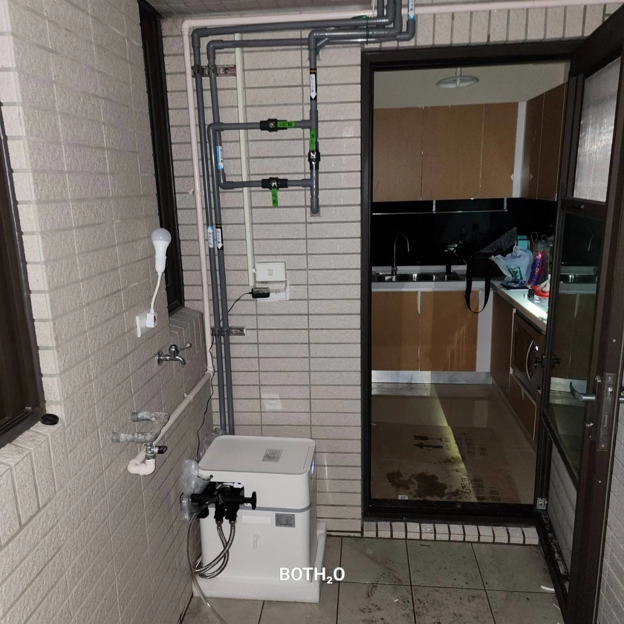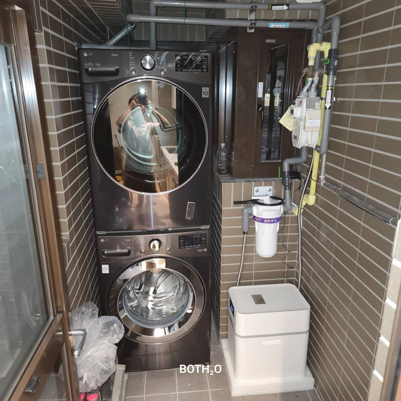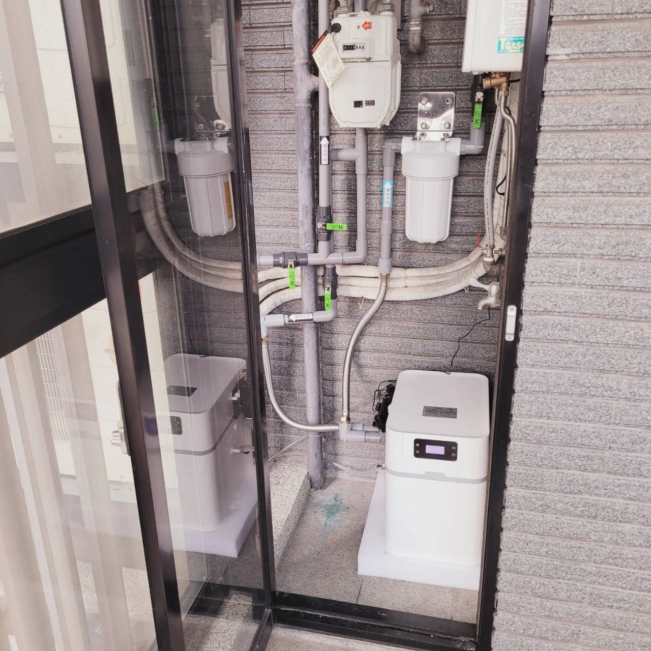案例3、客戶表明想要全戶淨水器+軟水機~但家中陽台除了洗衣機、熱水器、還要預留曬衣空間、若真的2台都裝下去!!那陽台空間被壓縮了!怎麼辦呢?😞