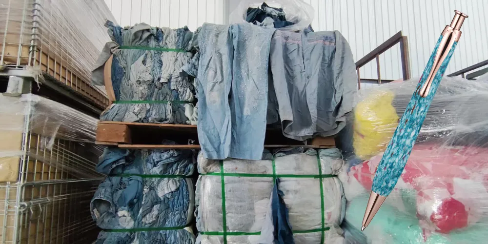 透過清洗、剪碎、壓製,結合金屬筆身,做成每支筆身都有不同紋理的「再衣筆」。