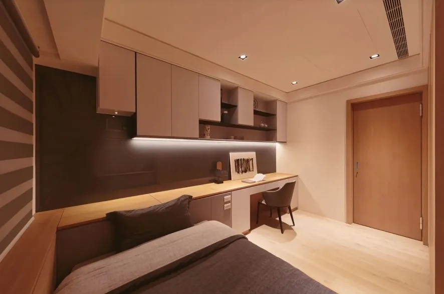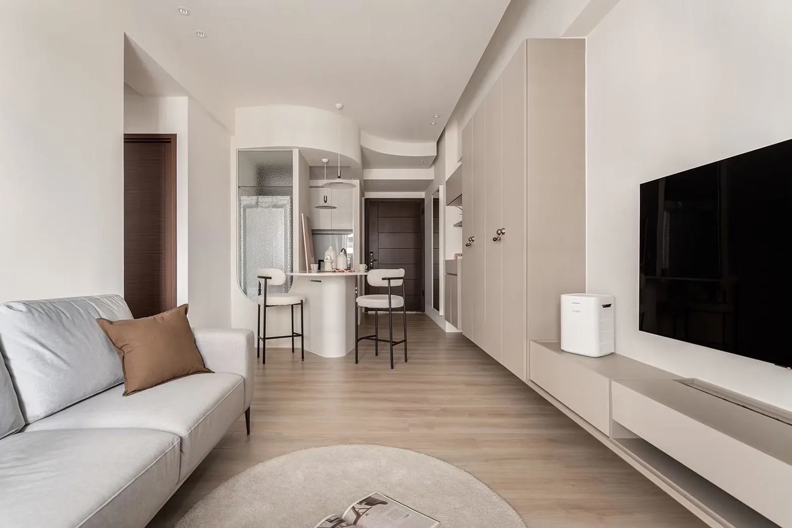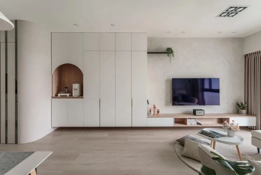 白色天花搭配暖色調光源與木質家具, 在柔和光影中營造溫暖舒適的生活感。