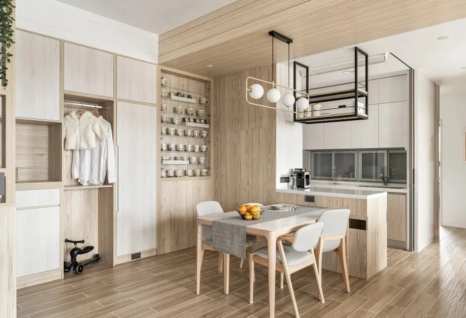 可局部,選擇原木或淺色木皮天花,與家具材質呼應, 創造自然溫潤、靜謐平衡的氛圍。