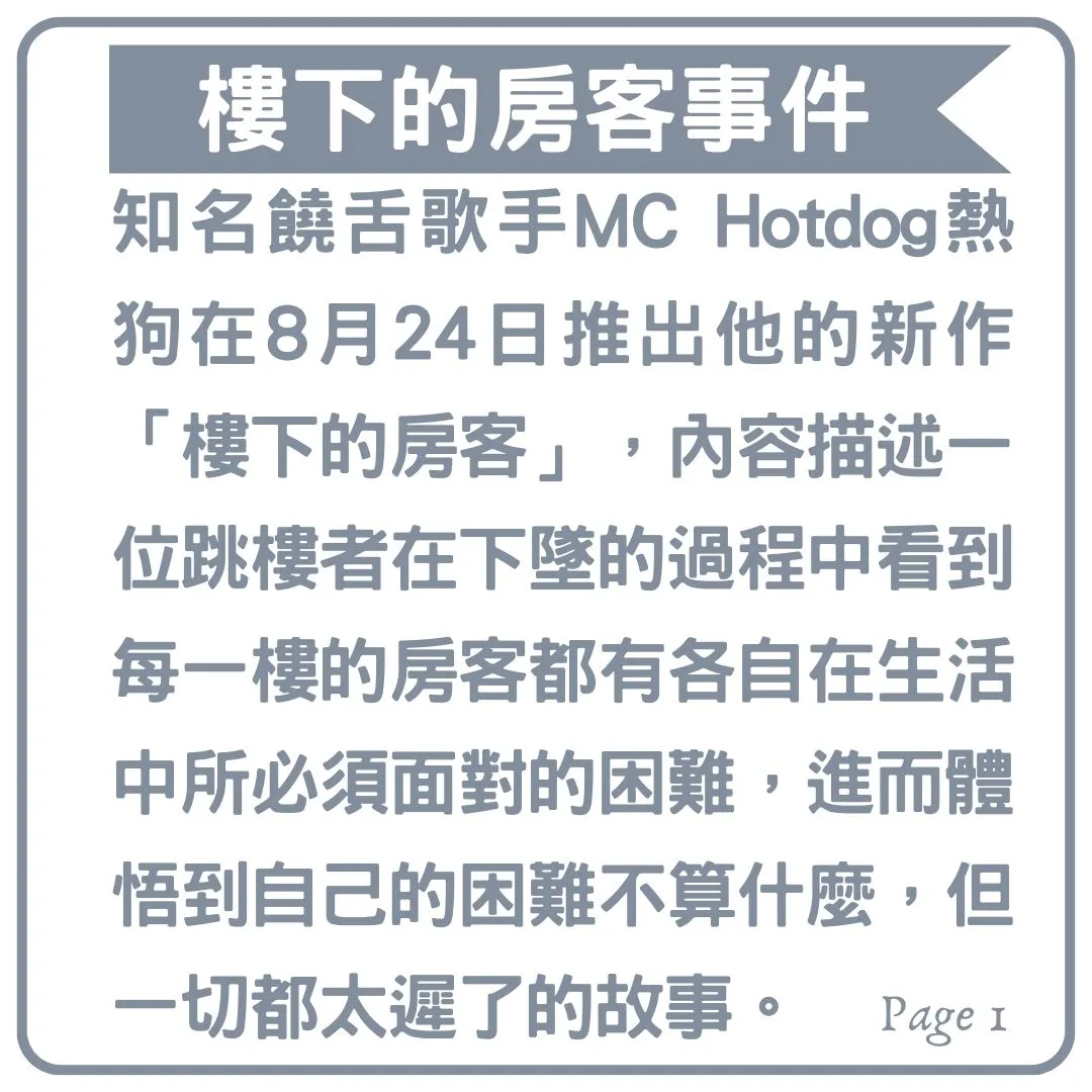 最近知名嘻哈饒舌歌手MC Hotdog發布了他的新歌「樓下的房客」,