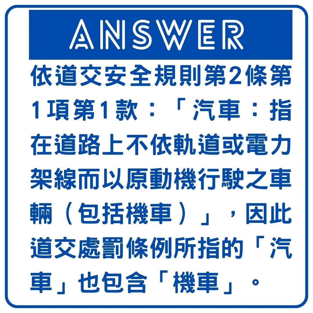 有民眾詢問明明道交處罰條例中對於違規停車的規範對象是「汽車」,