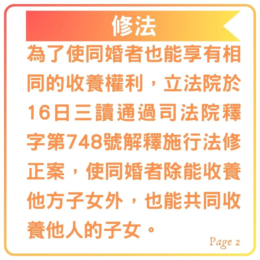 同婚者從原本只能收養他方子女變成可以共同收養他人子女了,