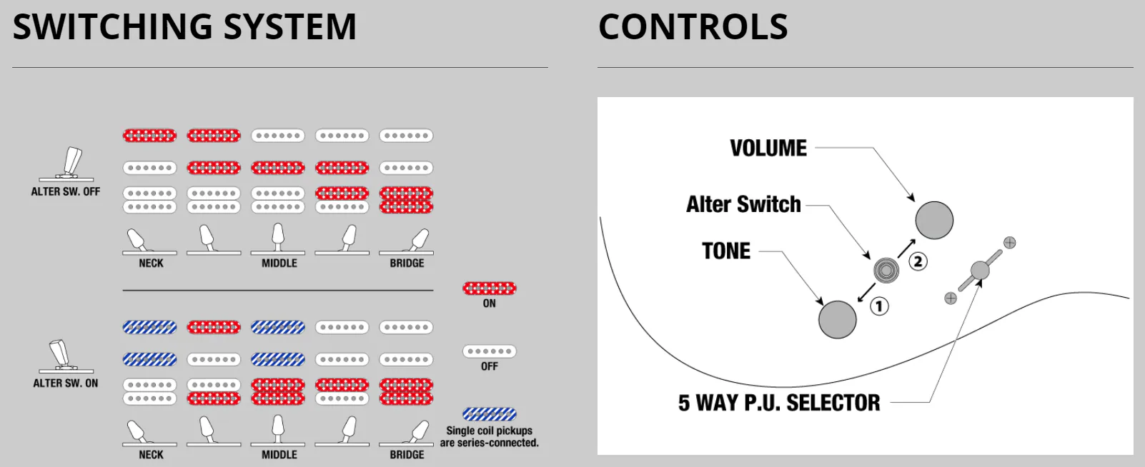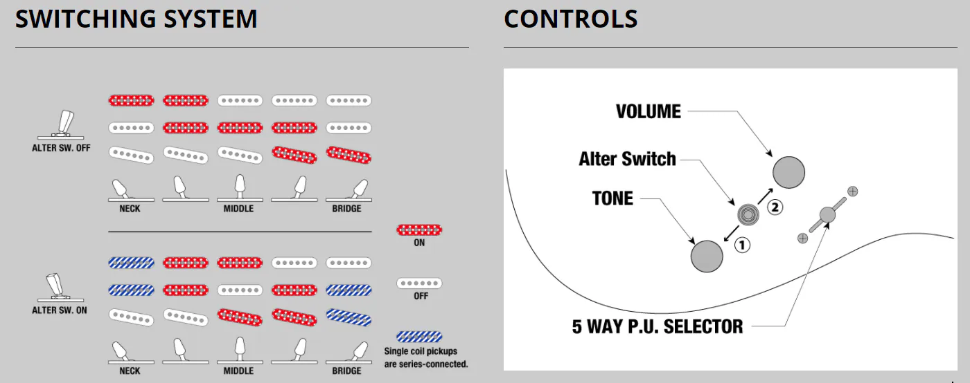 AZES40在一般狀態下有著大家熟悉的,三顆拾音器五段變換的SWITCH系統,