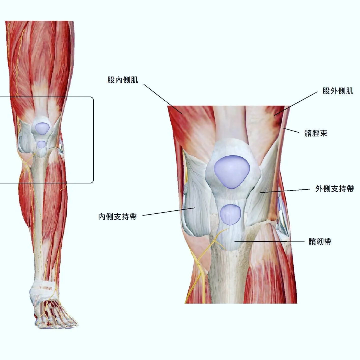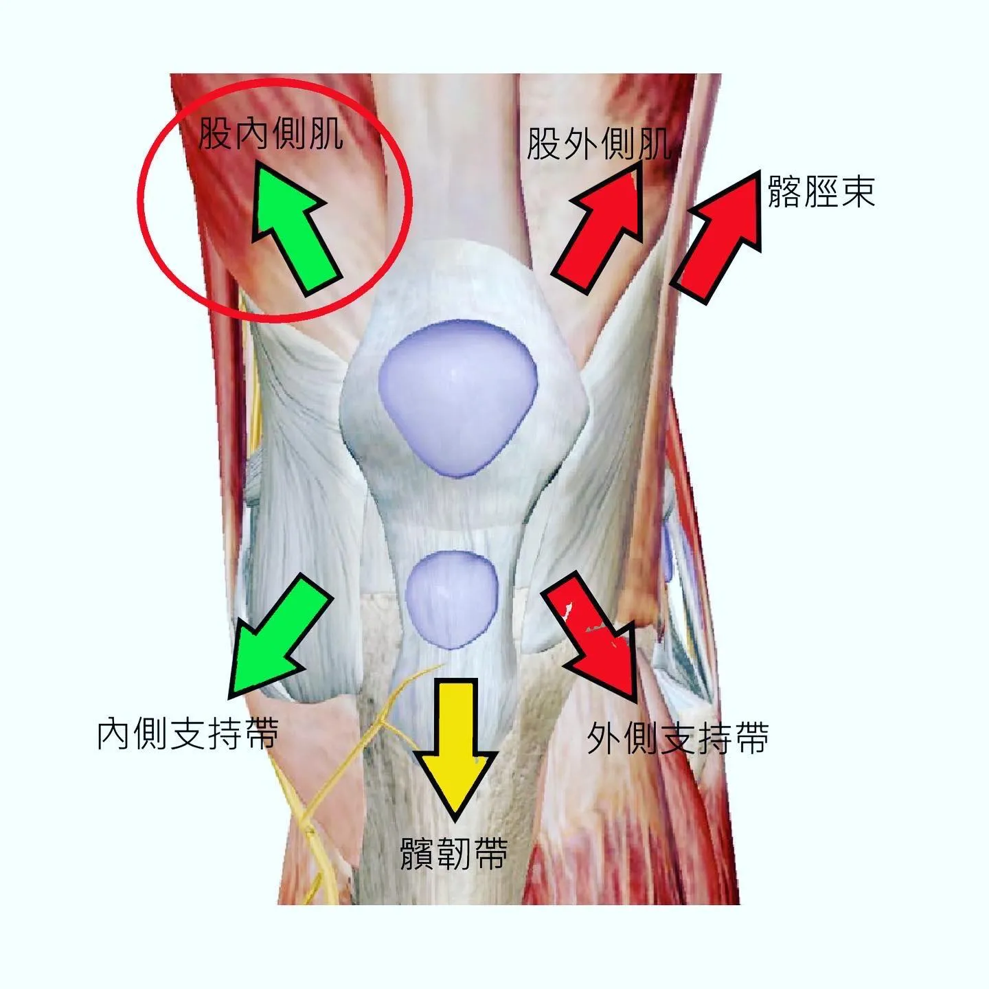 內側支持帶、外側支持帶、股四頭肌、髂脛束、髕骨韌帶