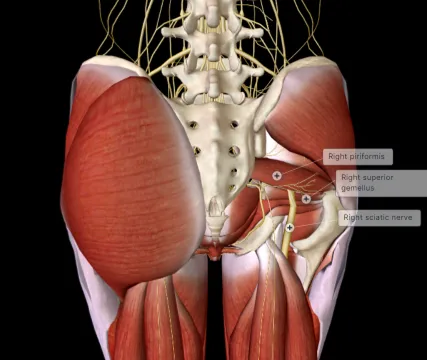 梨狀肌為在於髂後上棘PSIS中線,尾椎與股骨大轉子所形成的三角洲正中心上,而坐骨神經痛自腰椎經過臀部時正好通過梨狀肌下方。
