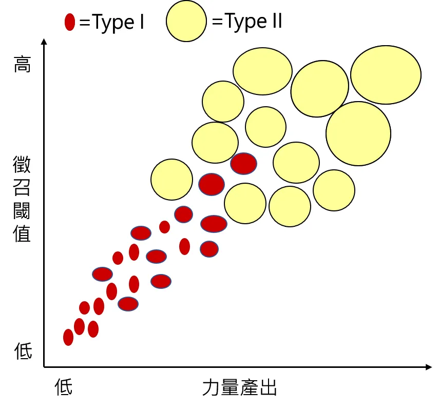 小運動單位之慢縮肌纖維(Type I)的徵召閾值較低,會優先被激活,而隨著負荷愈重強度增加,快縮肌纖維(Type II) 才再接著被激活,
