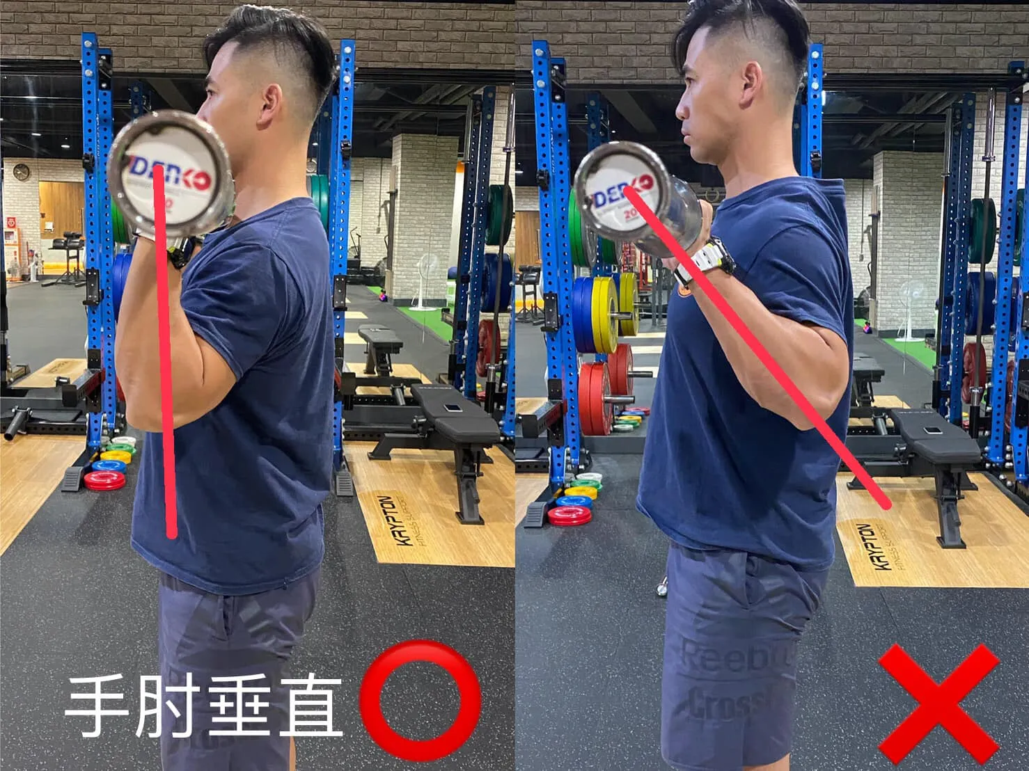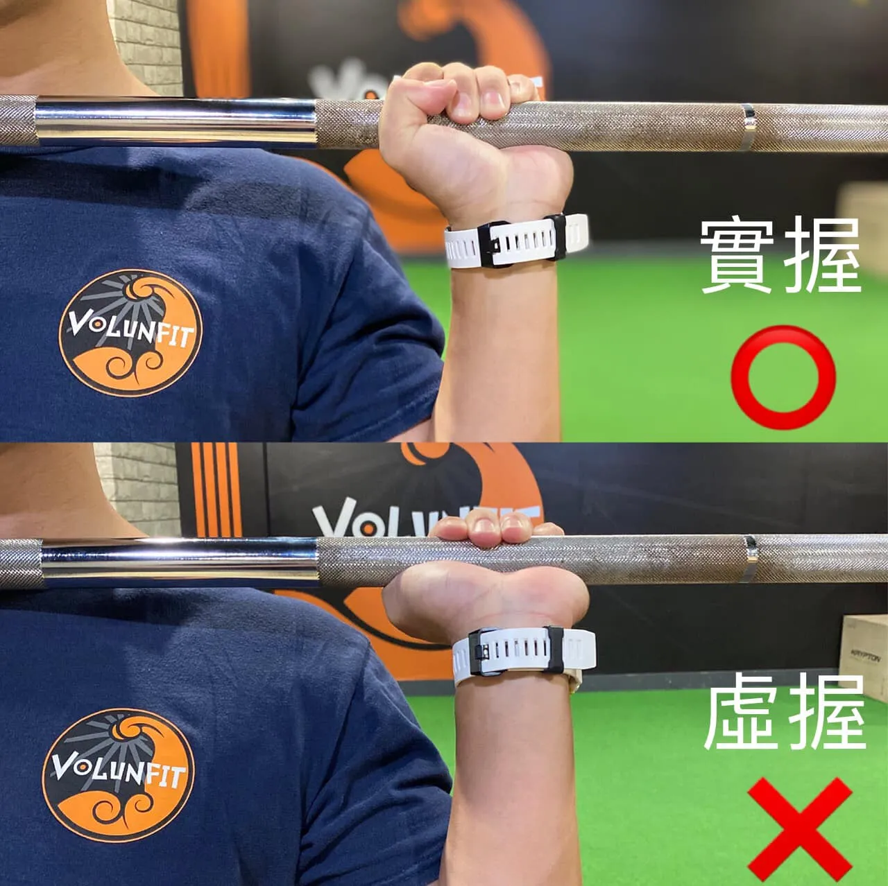 將槓鈴置於鎖骨、前三角肌上,讓手腕及前臂與地板成垂直,脊柱延伸保持穩定。