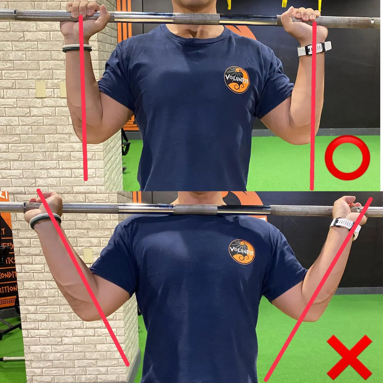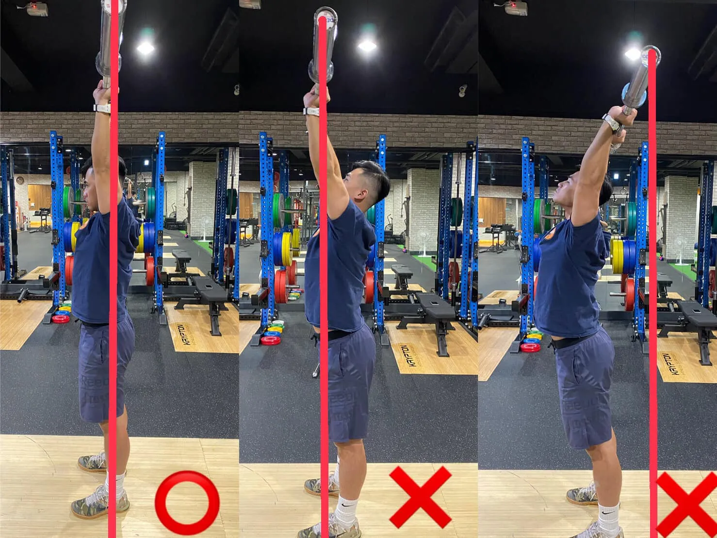 吸氣保持核心及身體的穩定,吐氣(技術性閉氣)將槓鈴推至頭頂,並且注意槓鈴的路徑是直上直下。
