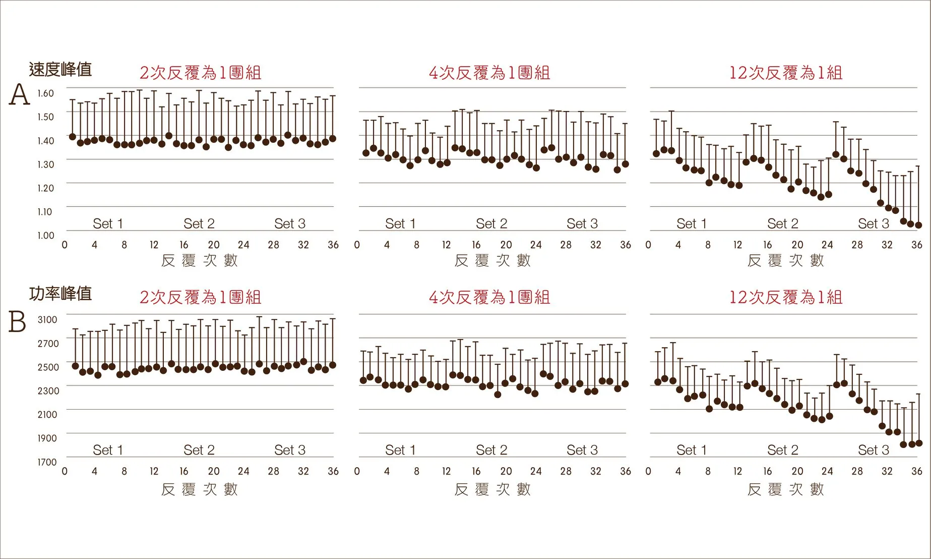 接下來讓我們看看其中的研究結果吧 (見圖4)!於縱軸部分,A指的是速度峰值,B指的是功率峰值;而橫軸部分則為反覆次數 (1至36下)。由左至右分別為CS2、CS4與傳統訓練方式。瞭解了相關變項後,便可以開始觀察圖中黑點的走向,大家可以發現,傳統訓練方式中的黑點有逐漸下降的趨勢,代表其動作的速度與功率因疲勞的關係而降低,相對的,CS2與CS4在3組的反覆次數中均能維持較佳的動作速度與功率!