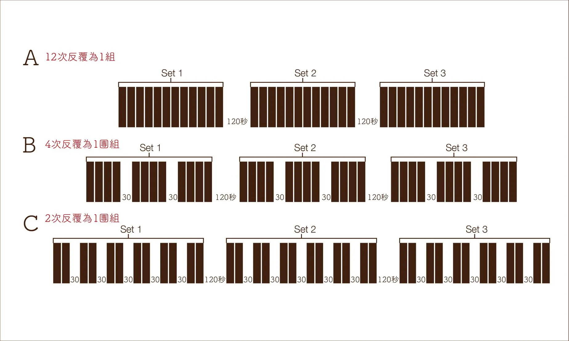 那要如何設計CS訓練方法呢?以此篇研究的蹲舉運動為例,作者將原本的傳統訓練方式 (A: 12次反覆為一組) 拆解成CS4 (B: 4次反覆為1團組) 與CS2 (C: 2次反覆為1團組),並在每個團組之間額外安排了30秒的組內休息時間 (見圖3)。