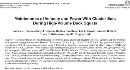Tufano, J. J., Conlon, J. A., Nimphius, S., Brown, L. E., Seitz, L. B., Williamson, B. D., & Haff, G. G. (2016). Maintenance of velocity and power with cluster sets during high-volume back squats. International Journal of Sports Physiology and Performance, 11(7), 885-892. doi: 10.1123/ijspp.2015-060
