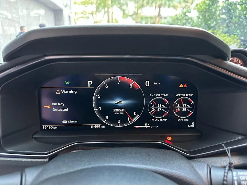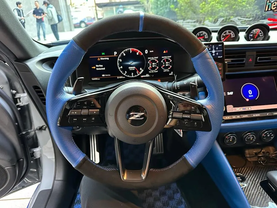 Nissan Z有著許多科技化的內裝配備,例如12.3吋數位儀錶以及8吋中央娛樂螢幕等,藍黑配色方向盤則是車主額外進行改裝的。