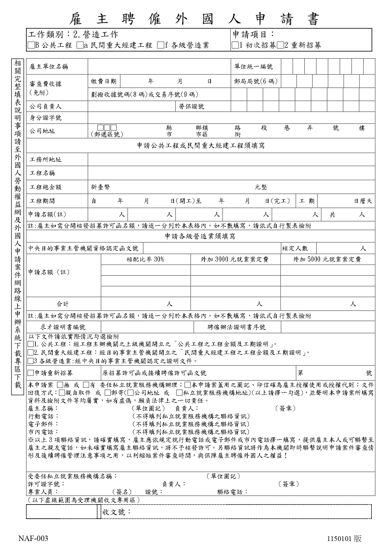 ※雇主承建民間重大經建工程,其契約總金額達新臺幣1億元以上,未達新臺幣2億元,且工程期限達1年6個月以上,經累計同一雇主承建其他民間重大經建工程契約總金額達新臺幣2億元以上者,亦得擔任雇主。但工程已完工、工程契約總金額未達新臺幣1億元或工程期限未達1年6個月者,工程契約總金額不予累計。