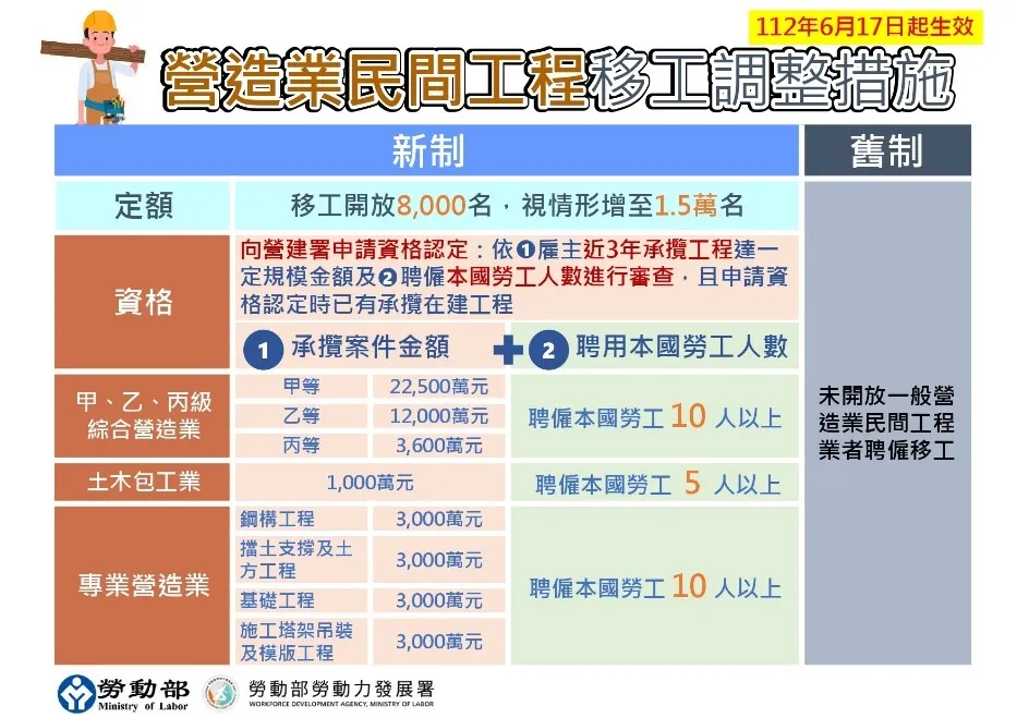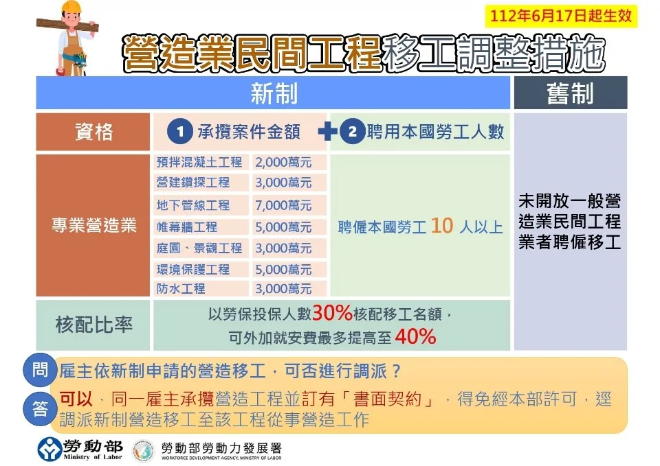 甲、乙、丙級綜合營造業、專業營造業及土木包工業,符合近3年承攬量及本國勞工人數門檻者,可依 30% 比例聘僱移工,繳納就安費最高可提高至 40%。