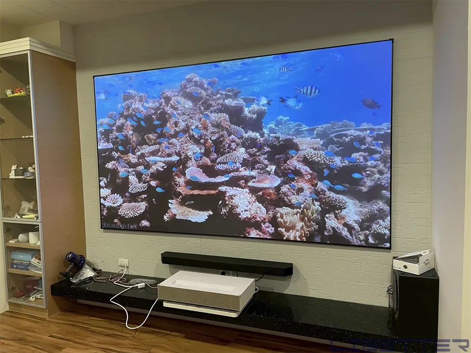 因此我們推薦並安裝了 LG CineBeam HU915 4K 超短焦雷射投影機,搭配專業抗光幕布,打造出客製化的家庭劇院空間。