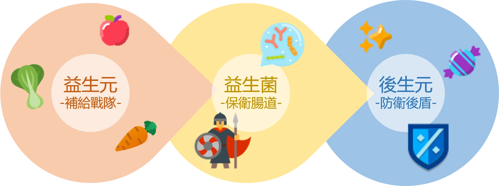 益生元主要工作為提供益生菌養分,使其長期定殖在腸道內。後生元則是提供益生菌良好的腸道環境,使益生菌更佳黏附在腸道上,調理腸道機能。