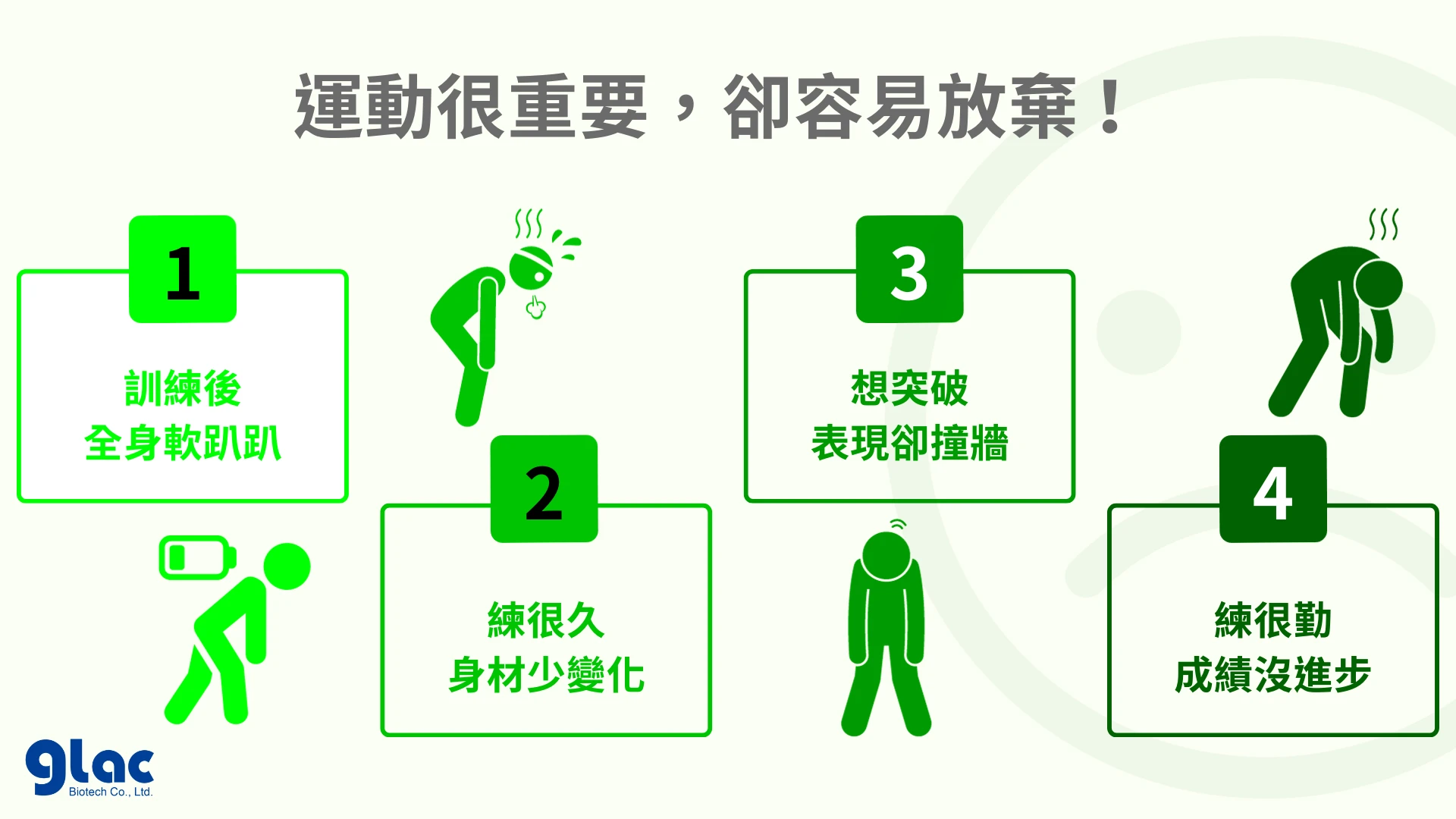 以上狀況發生後,許多運動族群開始找尋解決方案,服用運動益生菌或者乳清蛋白,希望運動核心能量能看見明顯效果,但往往卻無疾而終,在看不見效果的情況之下,運動習慣難以長期保持,成為許多日常運動族群的痛點。