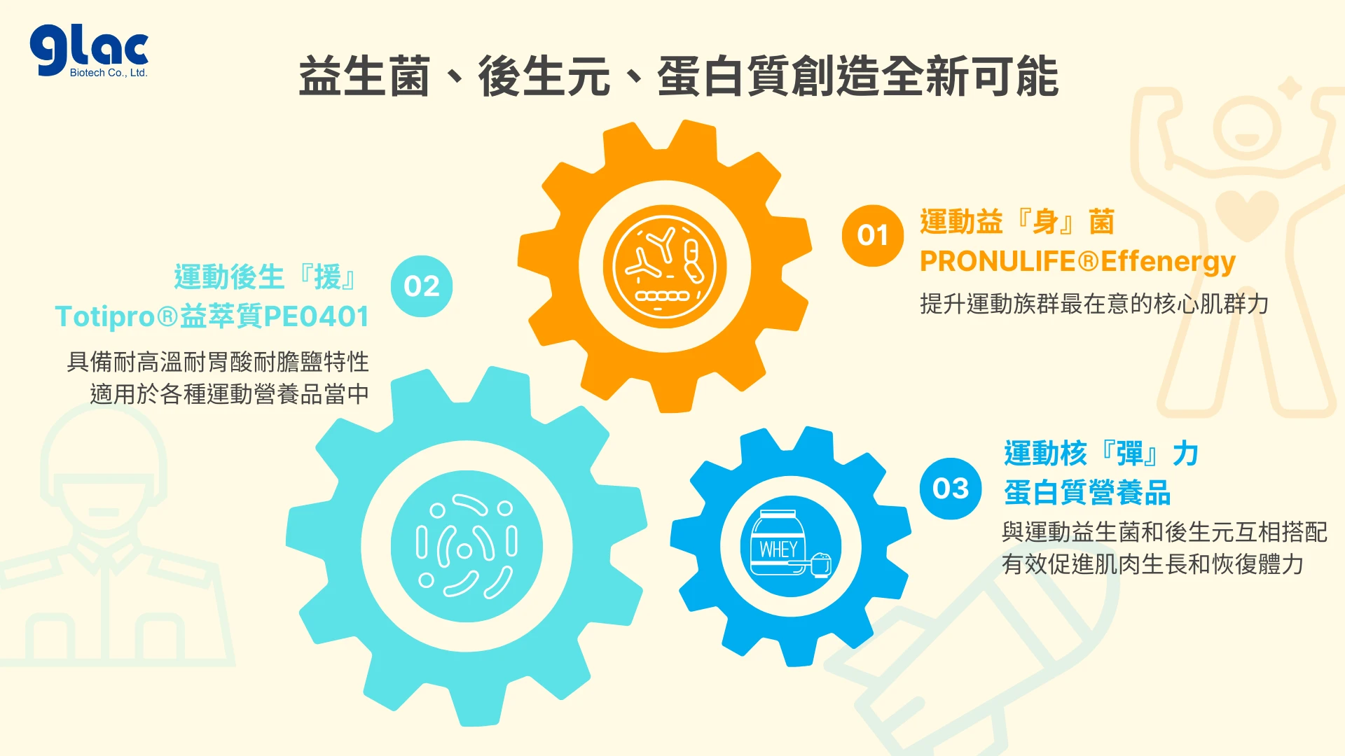運動益生菌PRONULIFE®Effenergy豐富腸道菌相,後生元Totipro®PE0401幫助身體有效吸收營養,乳清蛋白、蛋白質營養棒提供優質營養蛋白,日常運動習慣養成以及三項運動保健缺一不可,形成體內堅固核心能量,大幅增加身體肌肉質量,提升運動過程爆發力,為健身運動帶來更多可能。